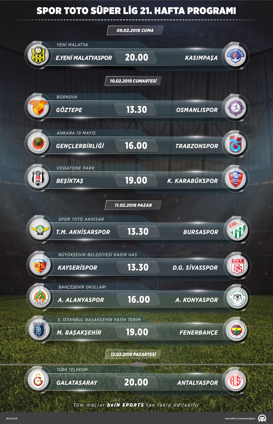 Spor Toto Süper Lig'de 21. haftanın açılış maçında bugün Evkur Yeni Malatyaspor ile Kasımpaşa karşı karşıya gelecek. Ligde 10 Şubat Cumartesi 3, 11 Şubat Pazar günü 4 ve12 Şubat Pazartesi tek maç oynanacak. ( Kemal Delikmen - Anadolu Ajansı )