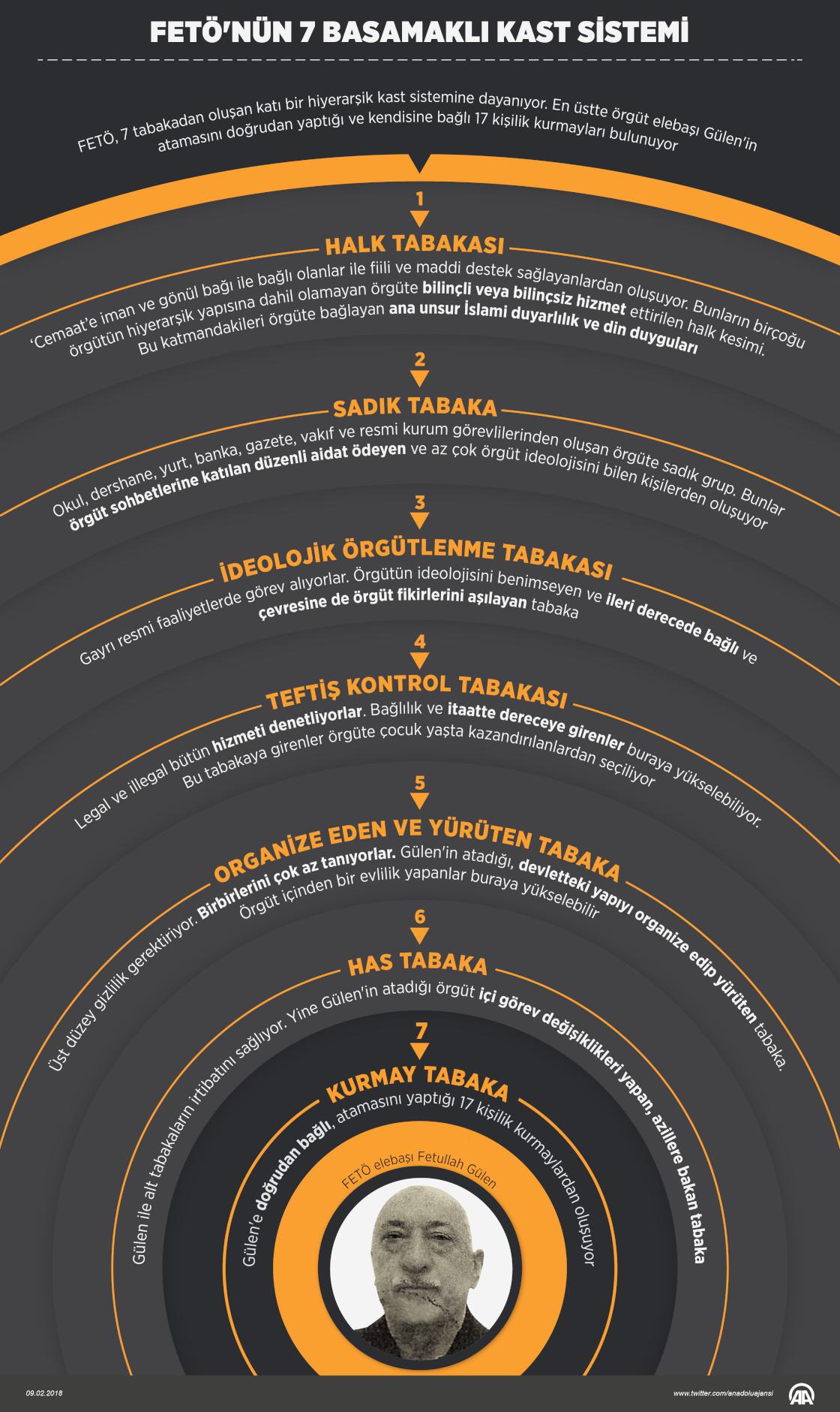 Fetullahçı Terör Örgütü (FETÖ) 7 tabakadan oluşan katı bir hiyerarşik kast sistemine dayanırken en üstte yer alan 7. tabakada, örgüt elebaşı Fetullah Gülen'in atamasını doğrudan yaptığı ve kendisine bağlı olan 17 kişilik kurmayları bulunuyor. ( Murat Usubaliev - Anadolu Ajansı )09 Şubat 2018•Güncelleme: 09 Şubat 2018