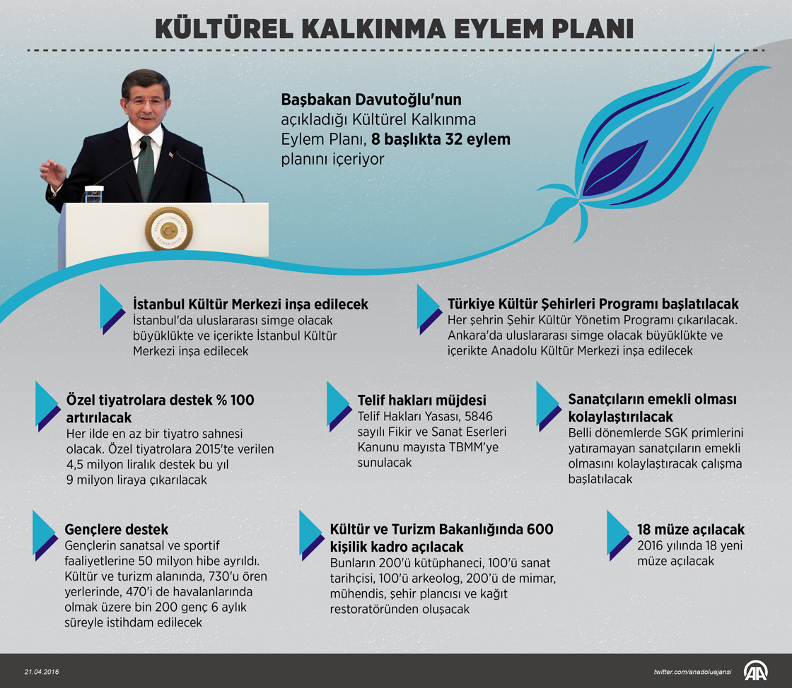 Başbakan Davutoğlu tarafından açıklanan plan kapsamında, Ankara'da, Anadolu Kültür Külliyesi, İstanbul'da ise İstanbul Kültür Külliyesi yapılacak. Emekliliği gelmiş olan sanatçılar, geriye