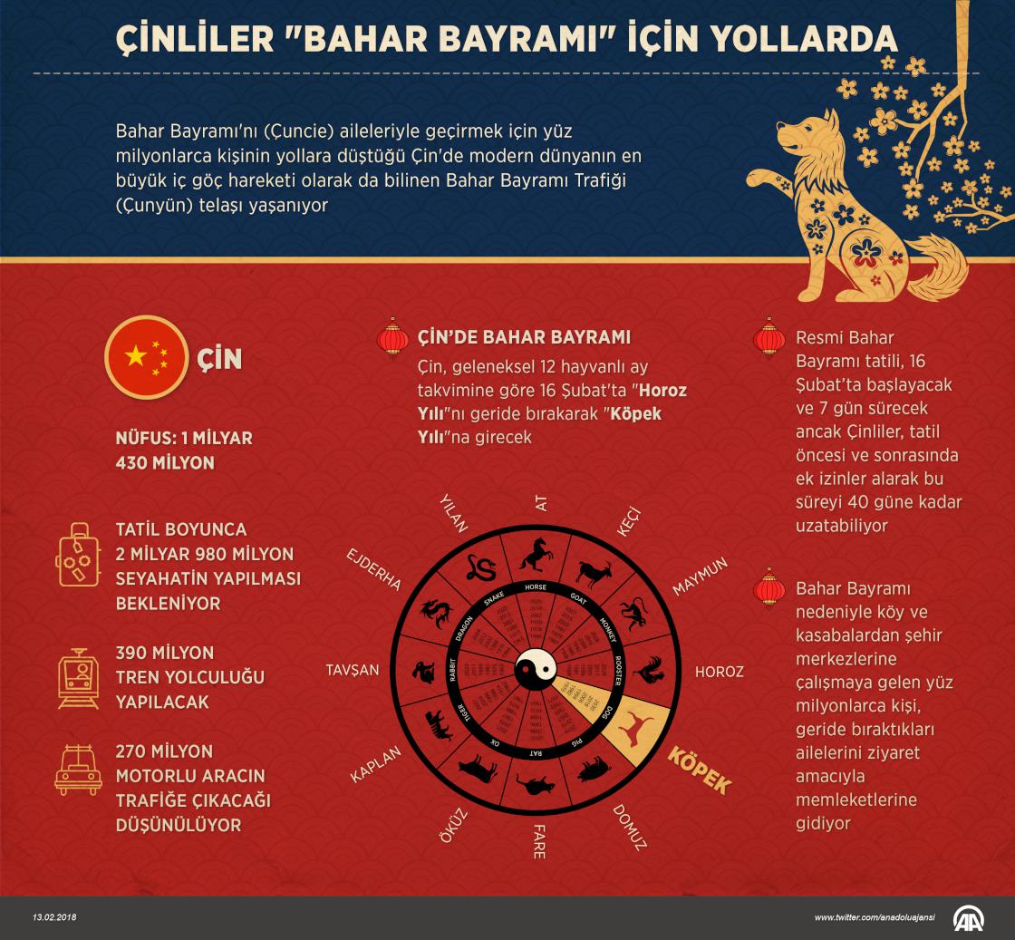 Bahar Bayramı'nı (Çuncie) aileleriyle geçirmek için yüz milyonlarca kişinin yollara düştüğü Çin'de modern dünyanın en büyük iç göç hareketi olarak da bilinen Bahar Bayramı Trafiği (Çunyün) telaşı yaşanıyor. Geleneksel 12 hayvanlı ay takvimine göre 16 Şubat'ta "Horoz Yılı"nı geride bırakarak "Köpek Yılı"na girecek ülkede, tatil boyunca 2 milyar 980 milyon seyahatin yapılması bekleniyor. ( Yasin Demirci - Anadolu Ajansı )13 Şubat 2018•Güncelleme: 13 Şubat 2018