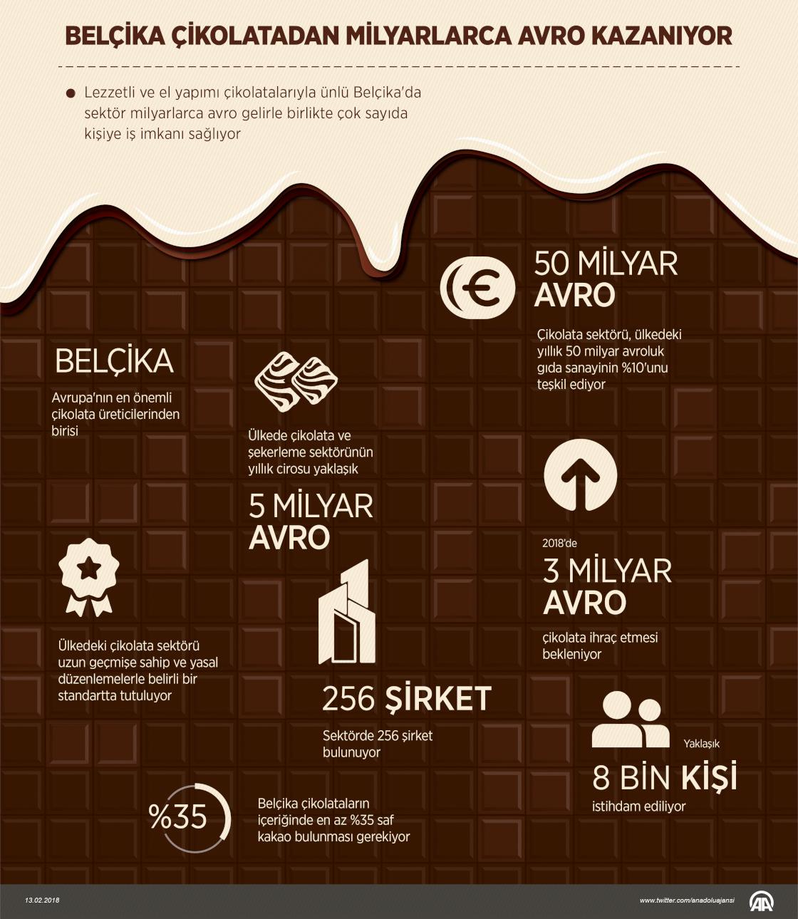 Lezzetli ve el yapımı çikolatalarıyla ünlü Belçika'da sektör milyarlarca avro gelirle birlikte çok sayıda kişiye iş imkanı sağlıyor. Ülkede çikolata ve şekerleme sektörünün yıllık cirosu 5 milyar avroyu buluyor. ( Ahmet Burak Özkan - Anadolu Ajansı )13 Şubat 2018•Güncelleme: 13 Şubat 2018