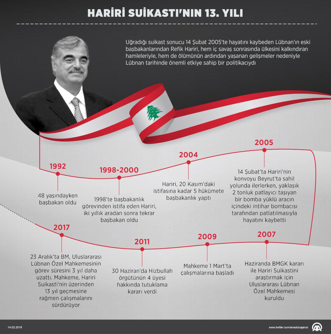 Uğradığı suikast sonucu 14 Şubat 2005'te hayatını kaybeden Lübnan'ın eski başbakanlarından Refik Hariri, hem iç savaş sonrasında ülkesini kalkındıran hamleleriyle, hem de ölümünün ardından yaşanan gelişmeler nedeniyle Lübnan tarihinde önemli etkiye sahip bir politikacıydı. ( Murat Usubaliev - Anadolu Ajansı )14 Şubat 2018•Güncelleme: 14 Şubat 2018