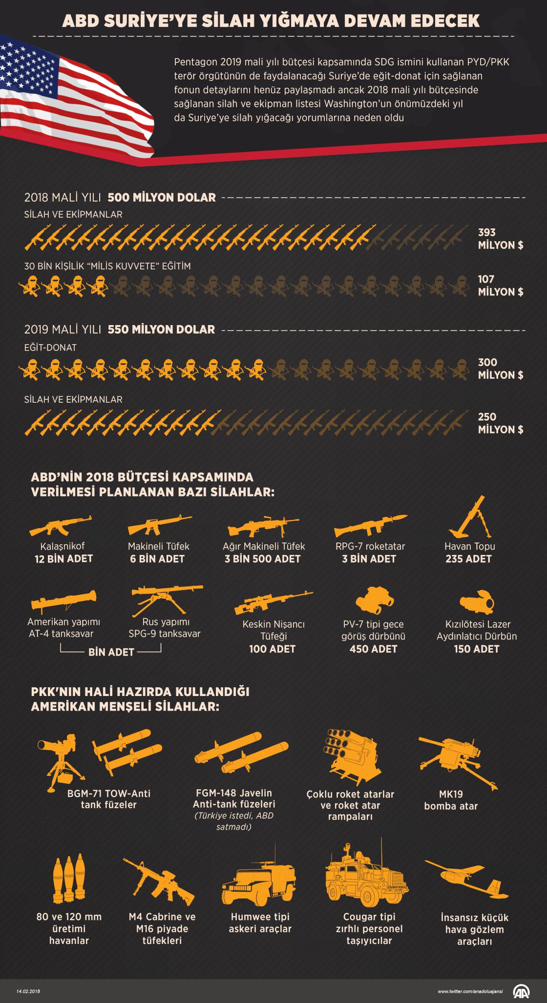 ABD Savunma Bakanlığı (Pentagon) 2019 mali yılı bütçesi kapsamında SDG ismini kullanan PYD/PKK terör örgütünün de faydalanacağı Suriye’de DEAŞ ile mücadele kapsamında 550 milyon dolar ayrılması "Washington’un önümüzdeki yıl da Suriye’ye silah yığacağını" gösteriyor. ( Muhammed Ali Yiğit - Anadolu Ajansı )14 Şubat 2018•Güncelleme: 14 Şubat 2018