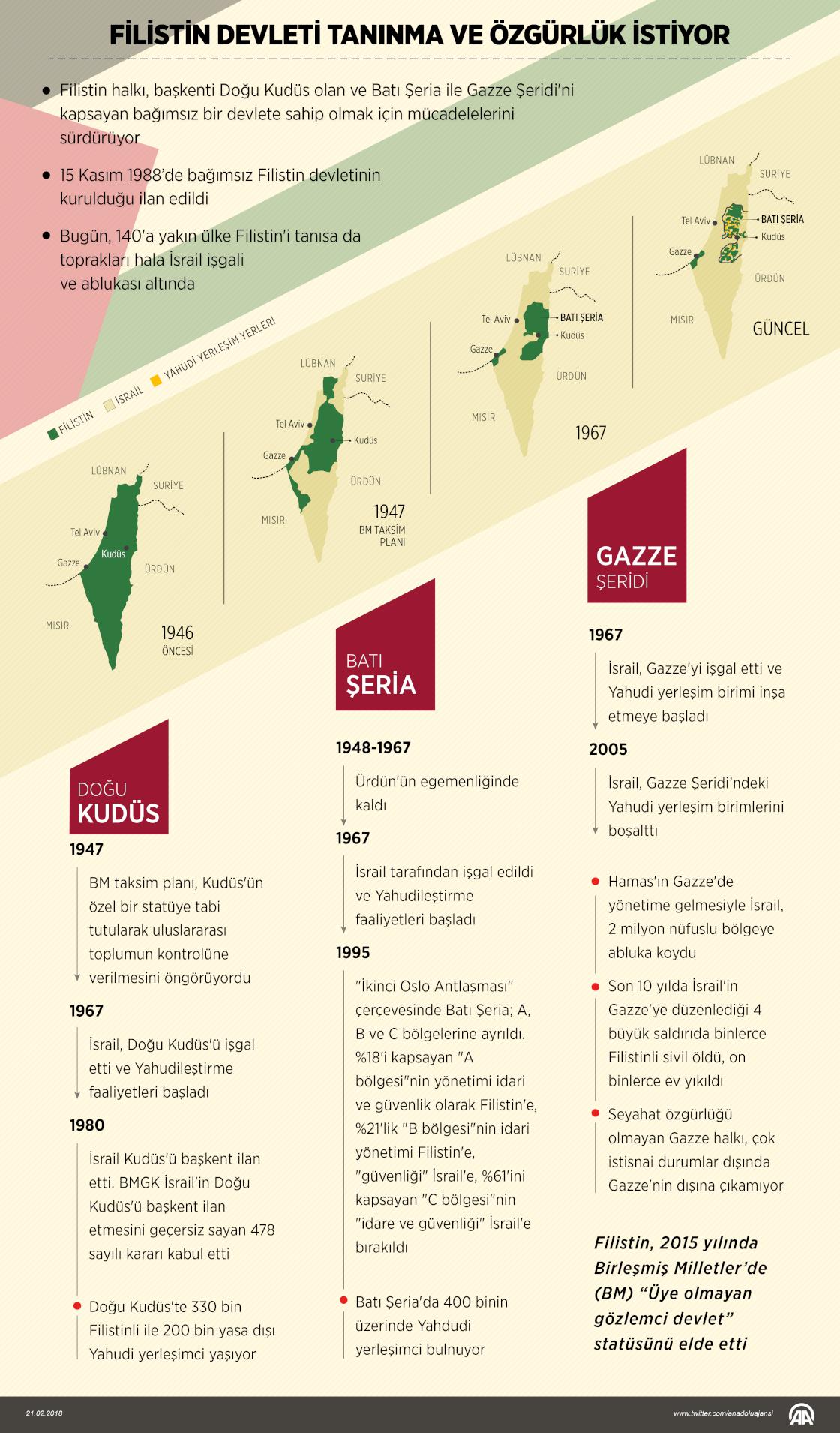 Filistin Devlet Başkanı Mahmud Abbas'ın dün Birleşmiş Milletler Güvenlik Konseyinde (BMGK) yaptığı konuşma, 29 yıl önce bağımsızlığını resmen ilan eden Filistin devletinin "tanınma ve özgürlük elde etme" çabalarını yeniden gündeme getirdi. ( Muhammed Ali Yiğit - Anadolu Ajansı )21 Şubat 2018•Güncelleme: 21 Şubat 2018