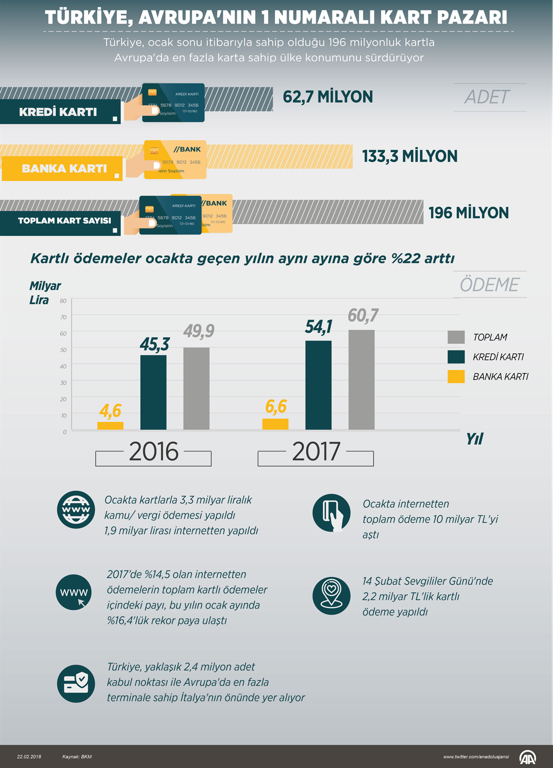 Bankalararası Kart Merkezi (BKM) verilerine göre Türkiye, ocak sonu itibarıyla 62,7 milyonu kredi kartı ve 133,3 milyonu banka kartı olmak üzere sahip olduğu 196 milyonluk kartla Avrupa'da en fazla karta sahip ülke konumunu sürdürüyor. ( Gözde Gültekinler - Anadolu Ajansı )22 Şubat 2018•Güncelleme: 22 Şubat 2018