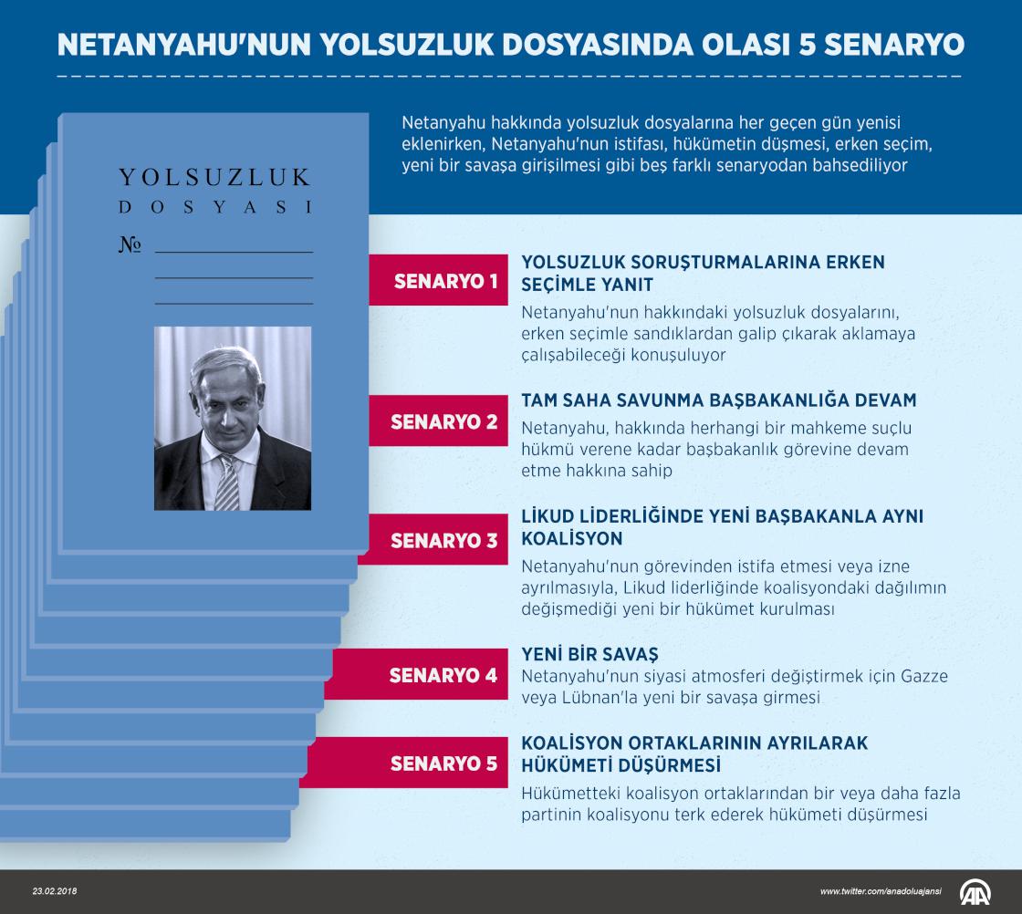 İsrail Başbakanı Binyamin Netanyahu hakkındaki yolsuzluk dosyalarına her gün bir yenisi daha eklenirken, uzmanlar Netanyahu'nun istifası, koalisyonun dağılması, erken seçim, Netanyahu olmadan yeni bir hükümet ve bir savaşa girişilmesi gibi ihtimallerinin tartışıldığı beş senaryodan bahsediyor.