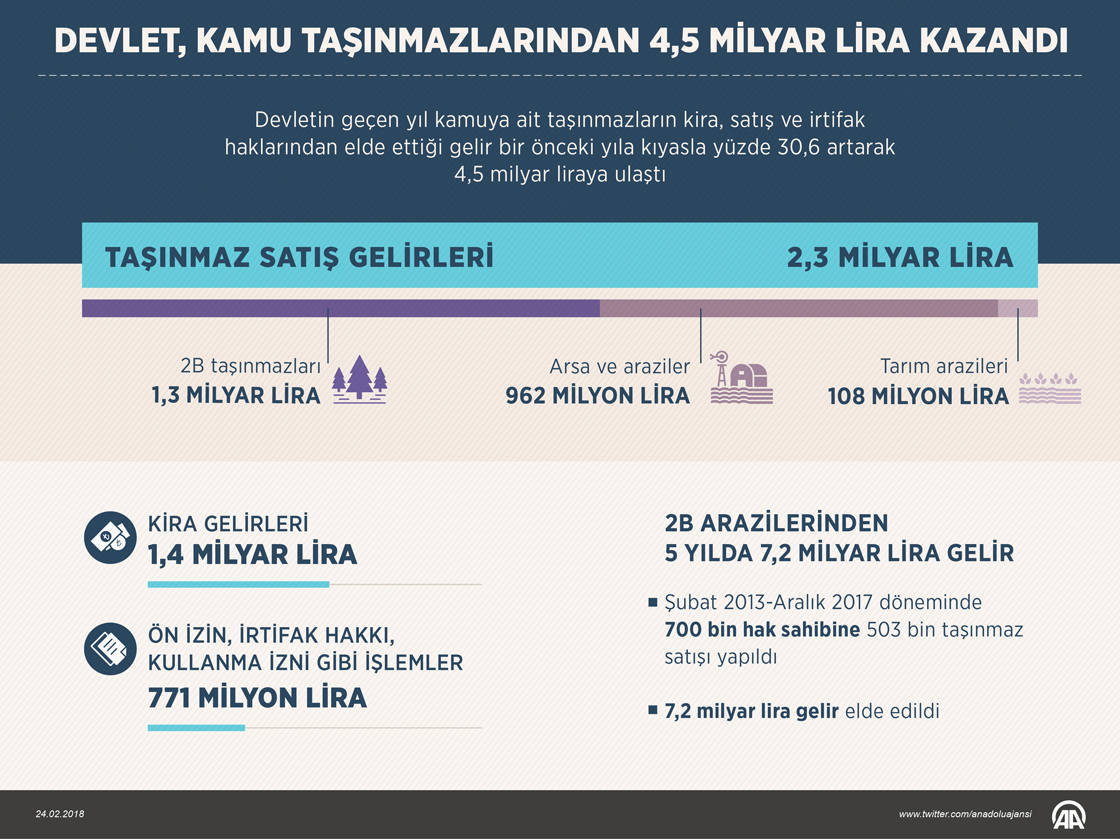 Devletin geçen yıl kamuya ait taşınmazlarının satış, kira ve irtifak haklarından elde ettiği gelir, bir önceki yıla göre yüzde 30,6 artarak 4,5 milyar liraya ulaştı. Satışlarda 2B taşınmazlarından yaklaşık 1,3 milyar lira, arsa ve arazilerden 962 milyon lira, tarım arazilerinden 108 milyon lira gelir sağlandı. Devletin kasasına kira gelirlerinden de 1,4 milyar lira girdi. (Anadolu Ajansı - Yasin Demirci)24 Şubat 2018•Güncelleme: 24 Şubat 2018
