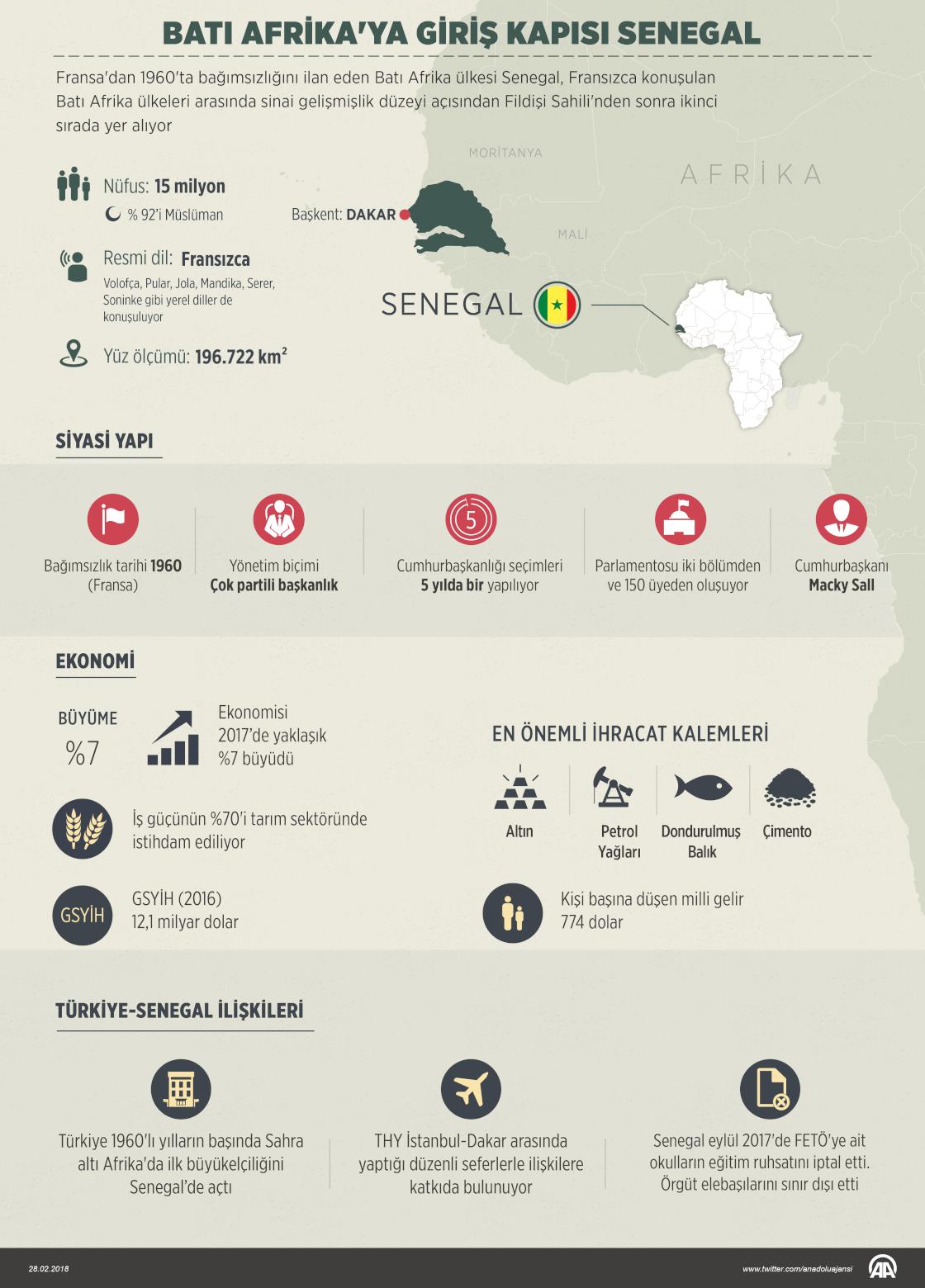 Fransa'dan 1960'ta bağımsızlığını kazanan Batı Afrika ülkesi Senegal, Fransızca konuşulan bölge ülkeleri arasında sınai gelişmişlik düzeyi açısından Fildişi Sahili'nden sonra ikinci sırada yer alıyor. Cumhurbaşkanı Recep Tayyip Erdoğan'ın 27 Şubat- 2 Mart tarihleri arasında yapacağı Afrika ziyaretlerinin son durağı olan Senegal, coğrafi konum bakımından Batı Afrika'ya giriş kapısı olarak görülüyor. ( Gözde Gültekinler - Anadolu Ajansı )28 Şubat 2018•Güncelleme: 28 Şubat 2018