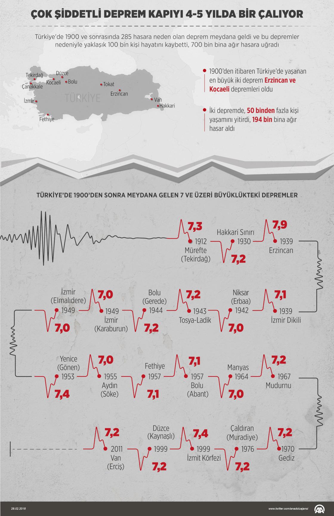 Türkiye'de 1900 ve sonrasında 285 hasara neden olan deprem meydana geldi ve bu depremler nedeniyle yaklaşık 100 bin kişi hayatını kaybetti, 700 bin bina ağır hasara uğradı. ( Kemal Delikmen - Anadolu Ajansı )