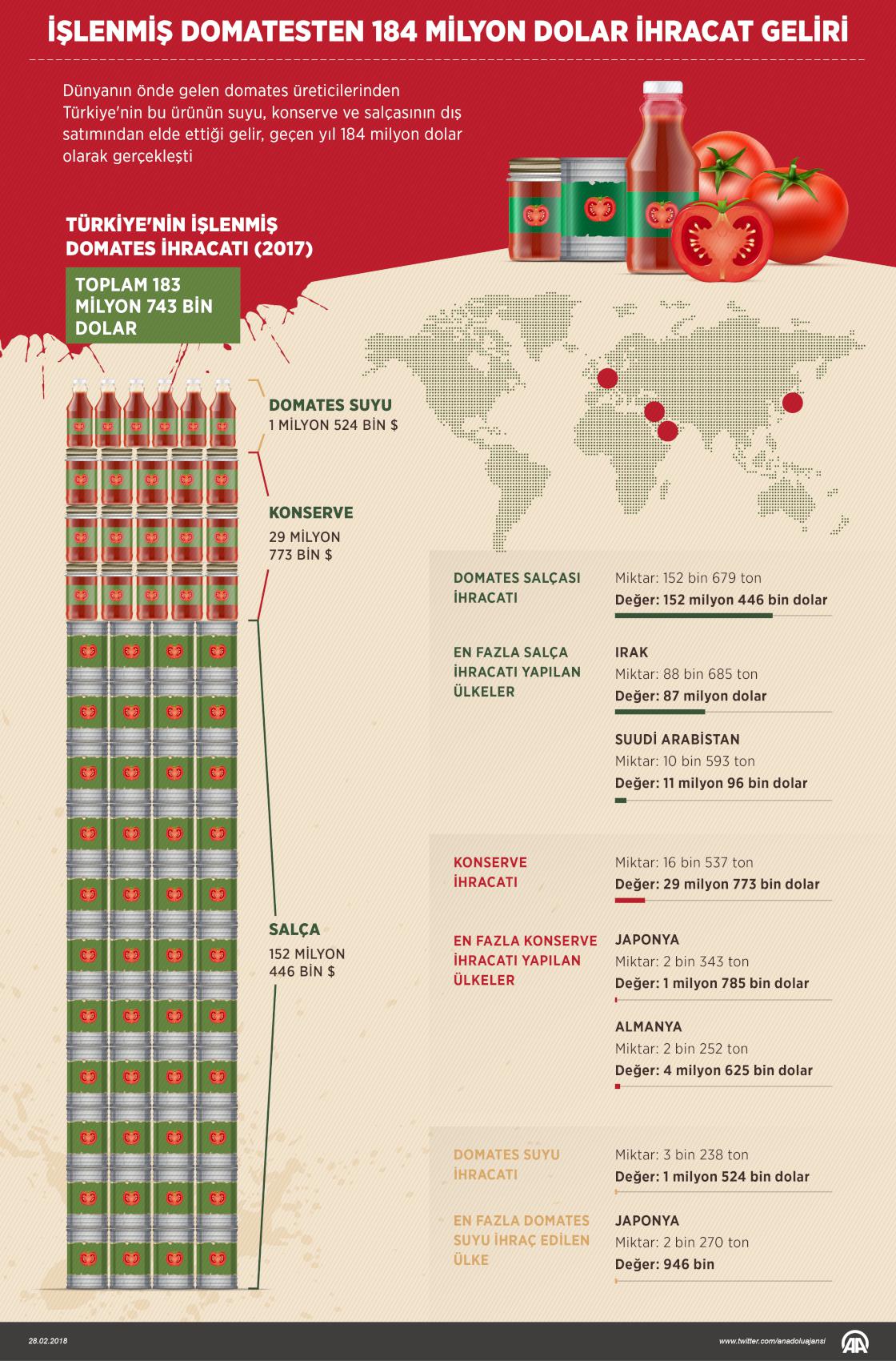 Türkiye'nin domates suyu, konservesi ve salçasının ihracatından elde ettiği gelir, geçen yıl yaklaşık 184 milyon dolar oldu. Domatesin konservesine Japonya ve Almanya'dan, salçasına Irak ve Suudi Arabistan'dan, domates suyuna da en çok Japonya'dan talep geldi. Geçen yıl domates konservesinden 29 milyon 773 bin dolar, domates salçasından 152 milyon 446 bin dolar ve domates suyundan 1 milyon 524 bin dolar olmak üzere toplam 183 milyon 743 bin dolar gelir elde edildi. ( Grafik: Yasin Demirci - Anadolu Ajansı )28 Şubat 2018•Güncelleme: 28 Şubat 2018