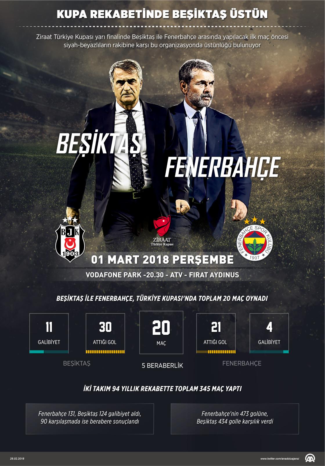 Ziraat Türkiye Kupası yarı finalinde Beşiktaş ile Fenerbahçe arasında yarın yapılacak ilk maç öncesi siyah-beyazlıların rakibine karşı bu organizasyonda üstünlüğü bulunuyor. Beşiktaş ile Fenerbahçe, Türkiye Kupası'nın geçmişinde daha önce 13 kez eşleşti. Üç kez final, dörder kez yarı final ve çeyrek final, birer kez de dördüncü tur ve son 16 turunda karşı karşıya gelen rakiplerden 9'unda Beşiktaş, 4'ünde Fenerbahçe turu geçti.
