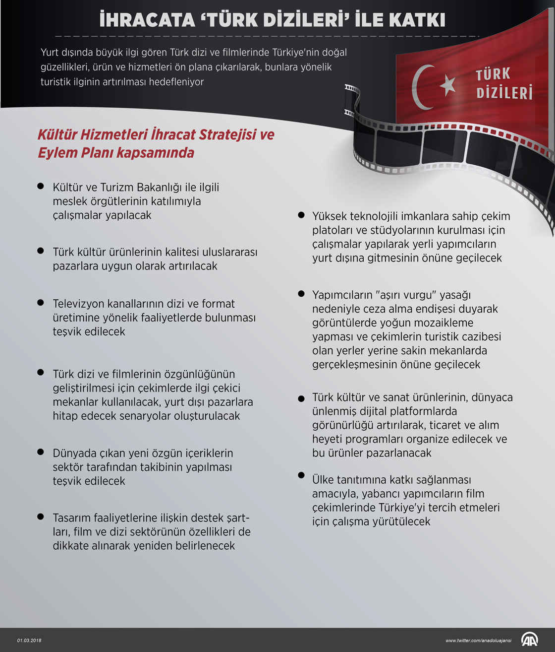 Yurt dışında büyük ilgi gören Türk dizi ve filmlerinde Türkiye'nin doğal güzellikleri, ürün ve hizmetleri ön plana çıkarılarak, bunlara yönelik turistik ilginin artırılması hedefleniyor. ( Gözde Gültekinler - Anadolu Ajansı )
