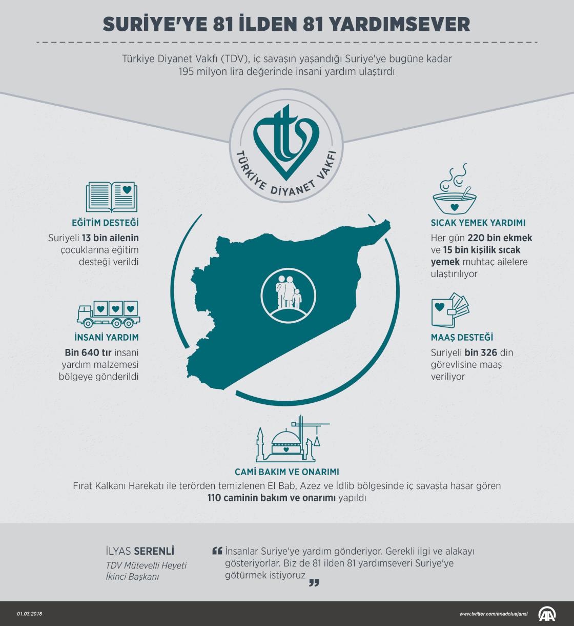 Türkiye'de ve dünyanın farklı coğrafyalarında, muhtaç insanlara, nakdi yardımın yanı sıra eğitim, gıda, yaşam malzemesi ulaştıran, hasar görmüş okul ve cami gibi yapıların onarılmasını sağlayan Türkiye Diyanet Vakfı (TDV), Suriye'ye yapılan yardımlar kapsamında, 81 ilden 81 yardımseveri bölgeye götürecek. Türkiye Diyanet Vakfı (TDV), iç savaşın yaşandığı Suriye'ye bugüne kadar 195 milyon lira değerinde insani yardım ulaştırdı. ( Murat Usubaliev - Anadolu Ajansı )01 Mart 2018•Güncelleme: 01 Mart 2018