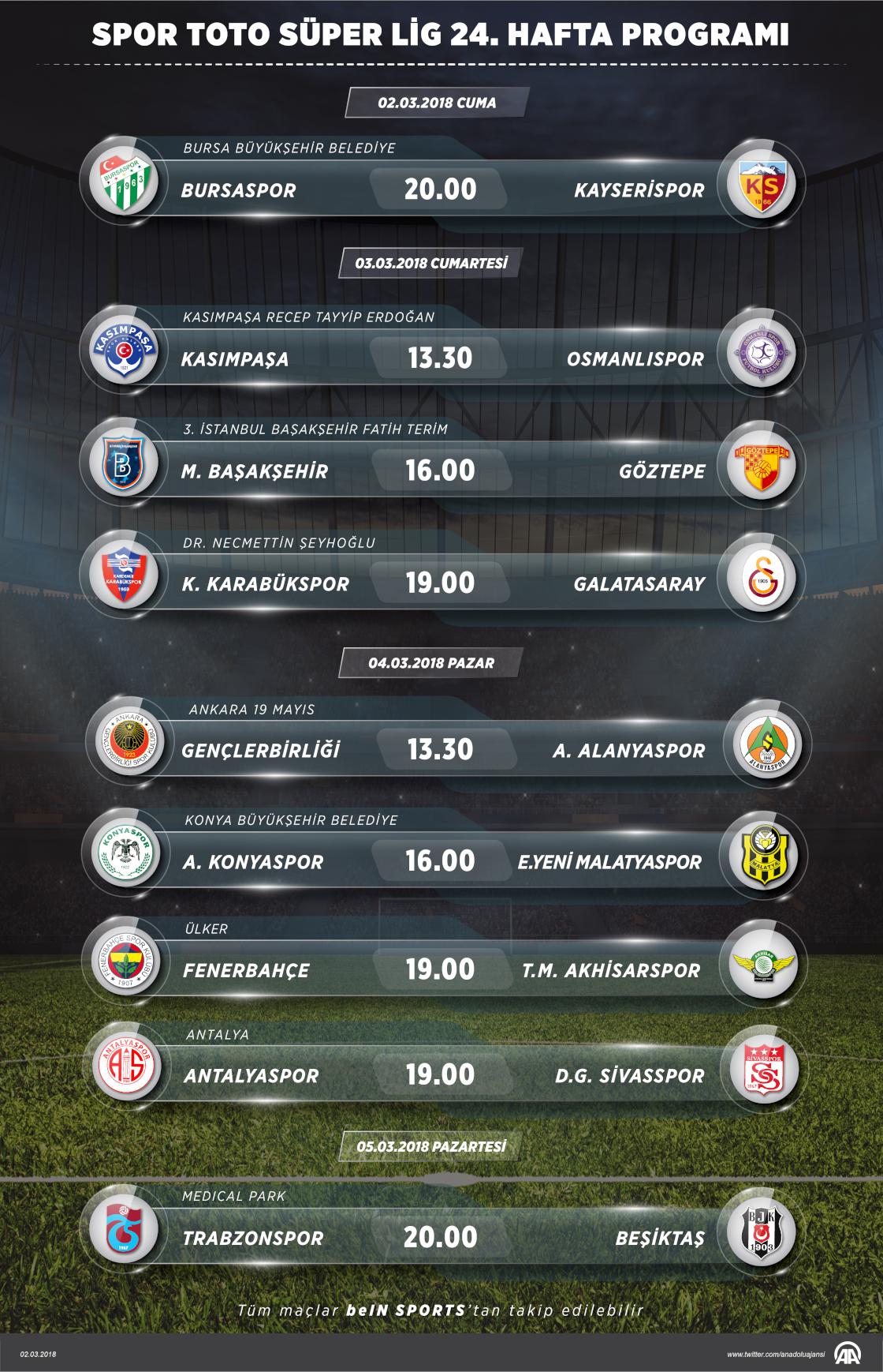 Spor Toto Süper Lig'de 24. haftanın açılış maçında bugün Bursaspor ile Kayserispor karşı karşıya gelecek. Ligde 3 Mart Cumartesi 3, 4 Mart Pazar günü 4 ve 5 Mart Pazartesi tek maç oynanacak. ( Kemal Delikmen - Anadolu Ajansı )