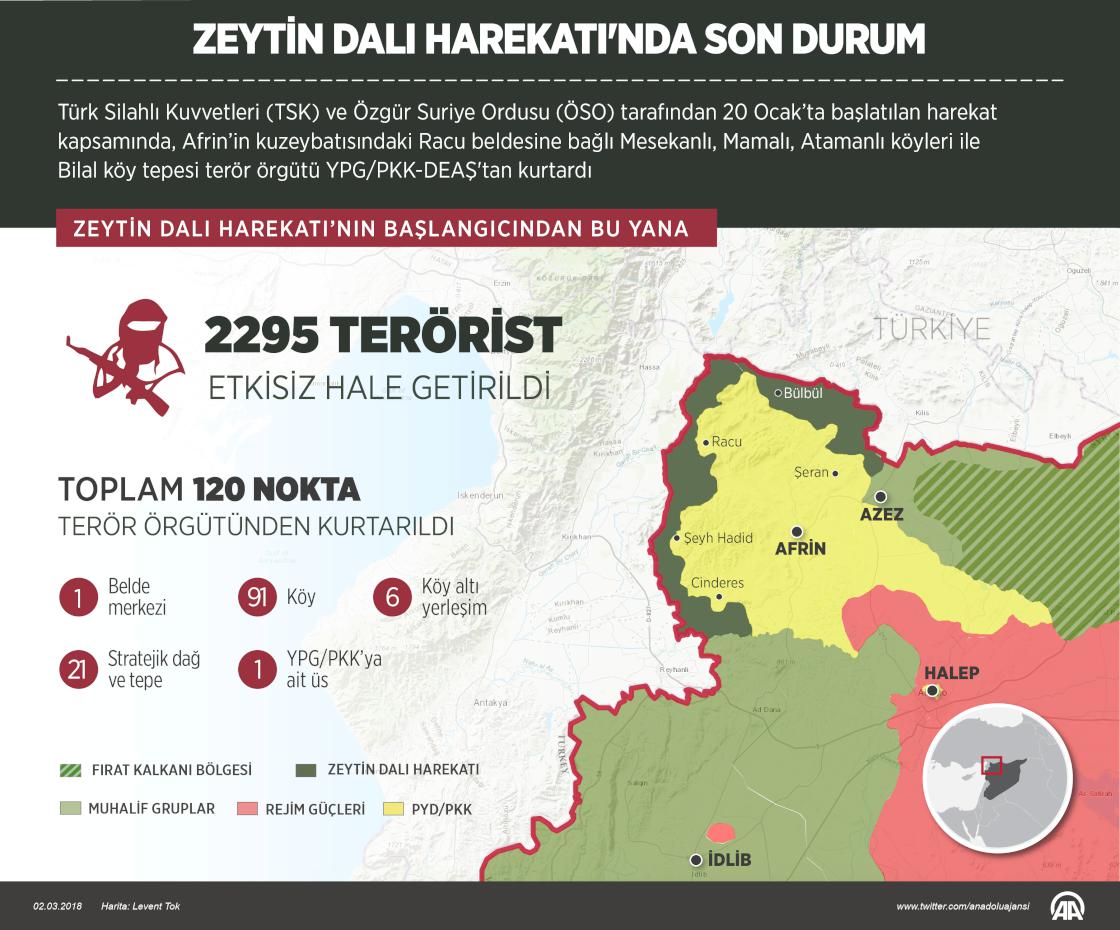 Türk Silahlı Kuvvetleri (TSK) ve Özgür Suriye Ordusu (ÖSO), Afrin’in kuzeybatısındaki Racu beldesine bağlı Mesekanlı, Mamalı, Atamanlı köyleri ile Bilal köy tepesini YPG/PKK-DEAŞ'tan kurtardı. Zeytin DAlı Harekatı'nın başından bu yana YPG/PKK-DEAŞ'ın işgalindeki Afrin'de biri belde merkezi, 91'i köy, 6'sı köy altı yerleşim ve 21'i stratejik dağ veya tepe, biri YPG/PKK'ya ait üs olmak üzere 120 noktayı ele geçirdi.