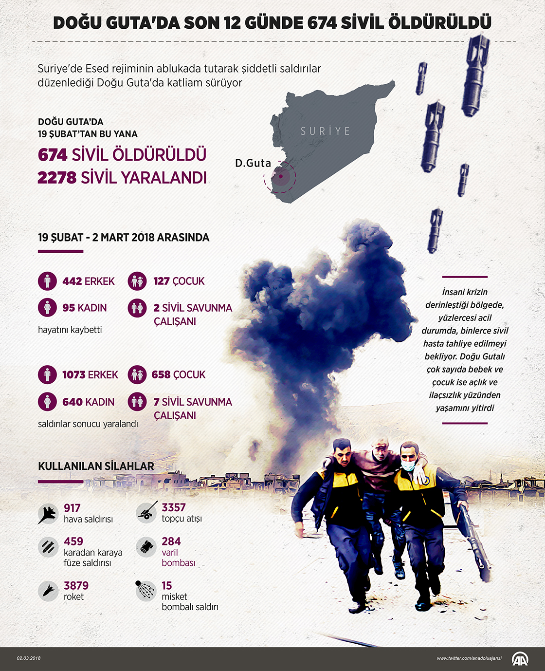 Esed rejimi ve destekçilerinin, Doğu Guta'ya 19 Şubat-2 Mart tarihleri arasında düzenlediği saldırılarda 674 sivil can verdi. Uçaklar bine yakın bombardıman yaptı. Yaklaşık 4 bin top, 4 bin roket, 300 varil bombası ve 500 füze sivillerin üzerine yağdı. (Grafik: Yasin Demirci)02 Mart 2018•Güncelleme: 02 Mart 2018