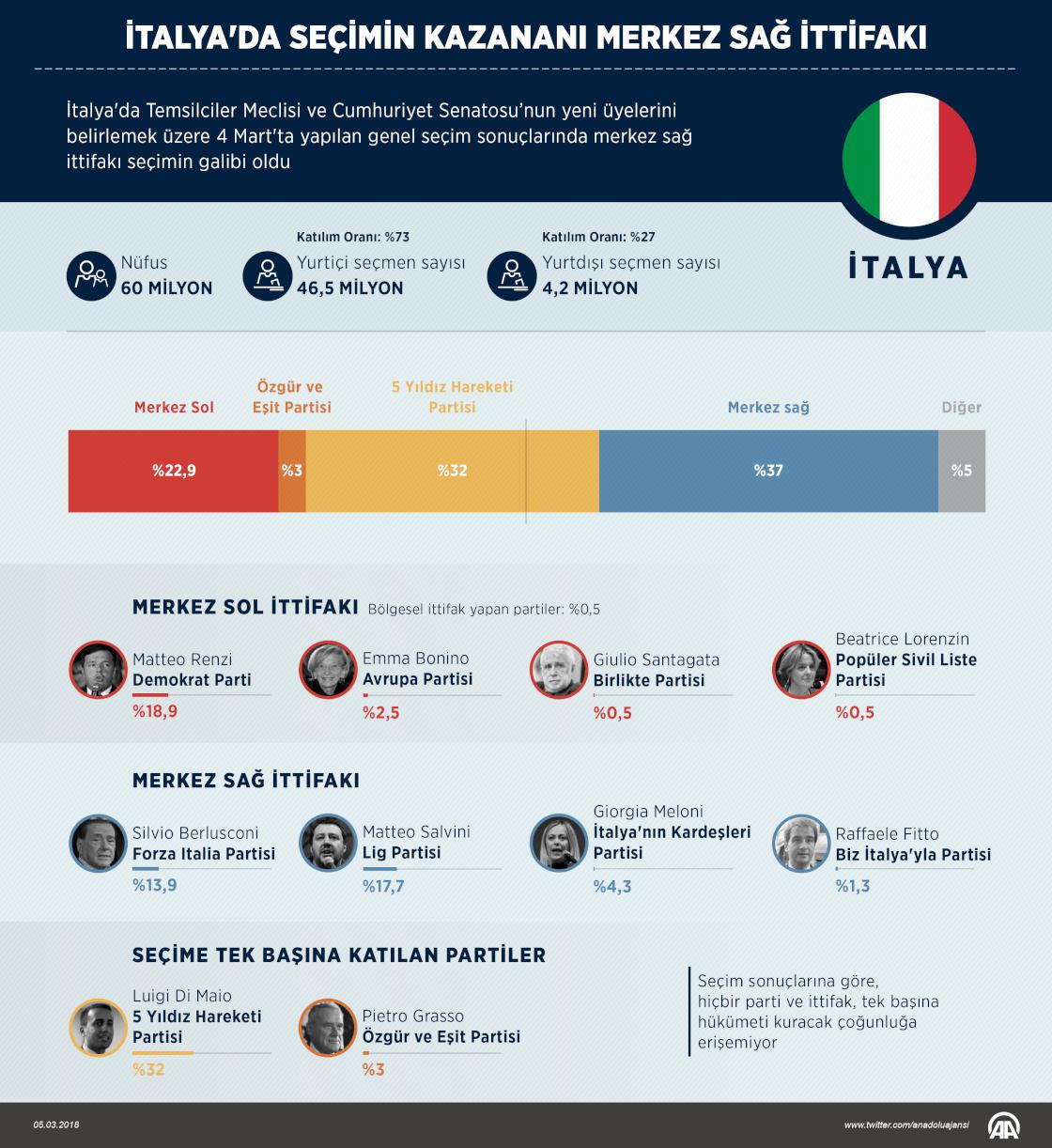İtalya'da Temsilciler Meclisi ve Cumhuriyet Senatosunun yeni üyelerini belirlemek için dün yapılan seçimin galibi yüzde 37,2 oyla eski Başbakan Silvio Berlusconi'nin Forza Italia Partisi, aşırı sağcı Lig, aşırı sağcı İtalya'nın Kardeşleri ve Biz İtalya'yla partilerinden oluşan merkez sağ ittifakı oldu. ( Yasin Demirci - Anadolu Ajansı )05 Mart 2018•Güncelleme: 05 Mart 2018