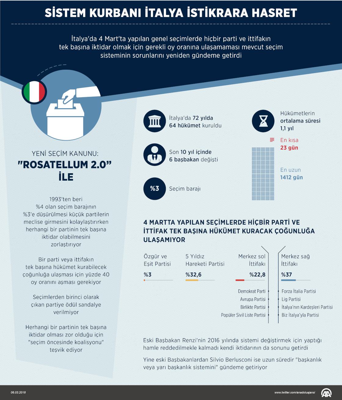 İtalya'da 4 Mart'taki genel seçimlerde hiçbir parti ve ittifakın tek başına iktidar olmak için gerekli oy oranına ulaşamaması sebebiyle ülkede koalisyon hükümetleri devri devam edecek. Seçim barajının düşüklüğü, siyasetteki bölünmüşlük ve mevcut seçim yasası ülkeyi koalisyon hükümetlerine mahkum ediyor. ( Yasin Demirci - Anadolu Ajansı )06 Mart 2018•Güncelleme: 06 Mart 2018