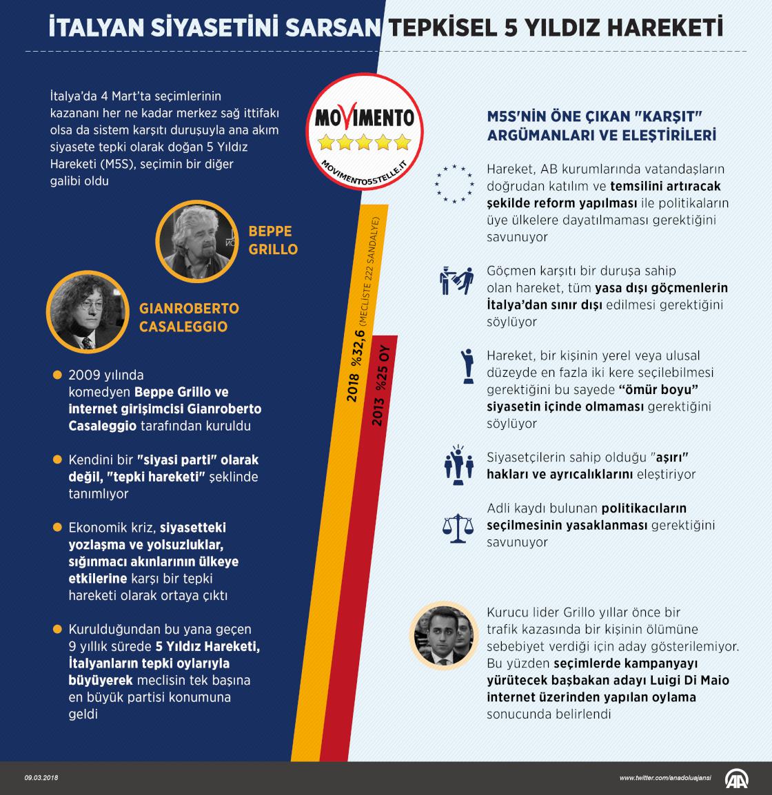 İtalya’da 4 Mart’taki seçimleri merkez sağ ittifakı kazansa da sistem karşıtı duruşuyla ana akım siyasete tepki olarak doğan 5 Yıldız Hareketi (M5S), seçimin diğer galibi oldu. Hareket, İtalya’da geleneksel şekilde sağ ve sol olmak üzere iki kutba ayrılmış siyasetteki dengeleri bozarak meclisin en büyük partisi olmayı başardı. ( Yasin Demirci - Anadolu Ajansı )09 Mart 2018•Güncelleme: 09 Mart 2018