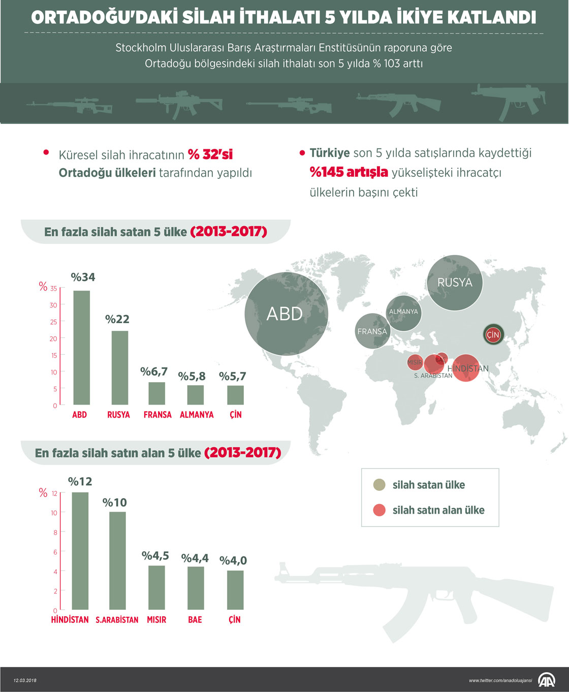 Ortadoğu ülkelerinin silah alımlarının son 5 yılda iki kattan fazla arttığı bildirildi. İsveç'teki Stockholm Uluslararası Barış Araştırmaları Enstitüsünün (SIPRI) küresel silah transferleri raporuna göre, Ortadoğu bölgesindeki silah ithalatı 2013- 2017 arasında, 2008-2013 yıllarına göre yüzde 103 arttı. ( Gözde Gültekinler - Anadolu Ajansı )13 Mart 2018•Güncelleme: 13 Mart 2018