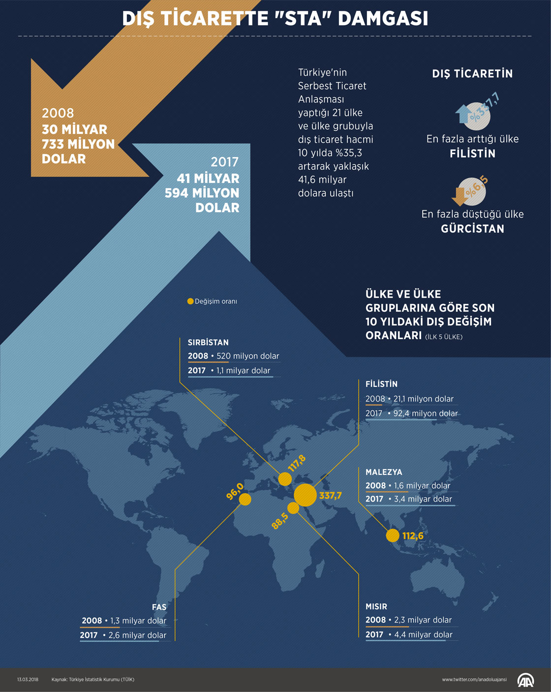 Türkiye'nin Serbest Ticaret Anlaşması yaptığı 21 ülke ve ülke grubuyla dış ticaret hacmi 10 yılda yüzde 35,3 artarak yaklaşık 41,6 milyar dolara ulaştı. Türkiye'nin STA yaptığı ülkeler arasında bu dönemde dış ticaretinin en fazla arttığı ülke yüzde 338 ile Filistin oldu.13 Mart 2018•Güncelleme: 13 Mart 2018