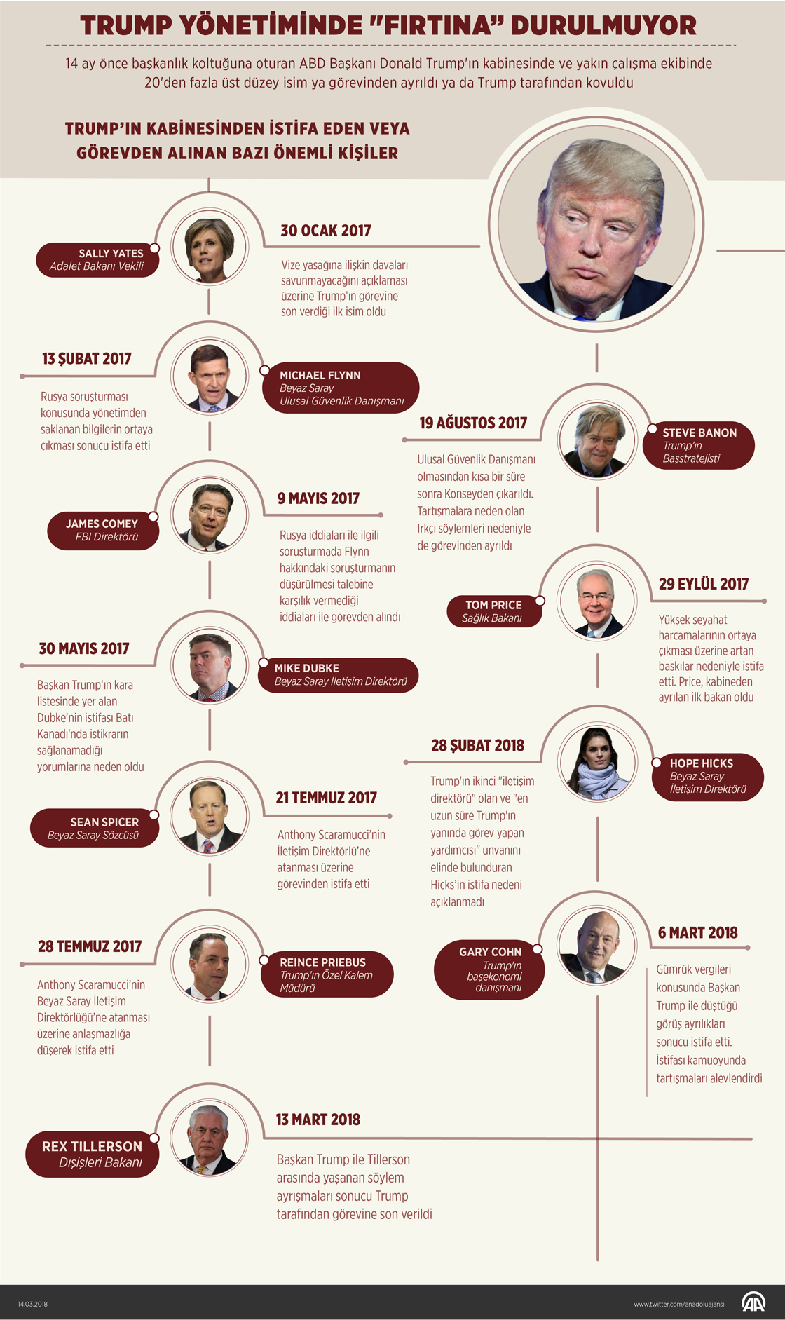 ABD Dışişleri Bakanı Rex Tillerson'ın görevine son veren ve 14 aylık görev süresi içinde kabinesinde ve yakın çalışma ekibinde 20'den fazla isim değişen Başkan Donald Trump, ülke tarihinde kısa süre içinde en fazla fire veren başkanlardan biri olarak kayıtlara girdi. ( Gözde Gültekinler - Anadolu Ajansı )14 Mart 2018•Güncelleme: 14 Mart 2018