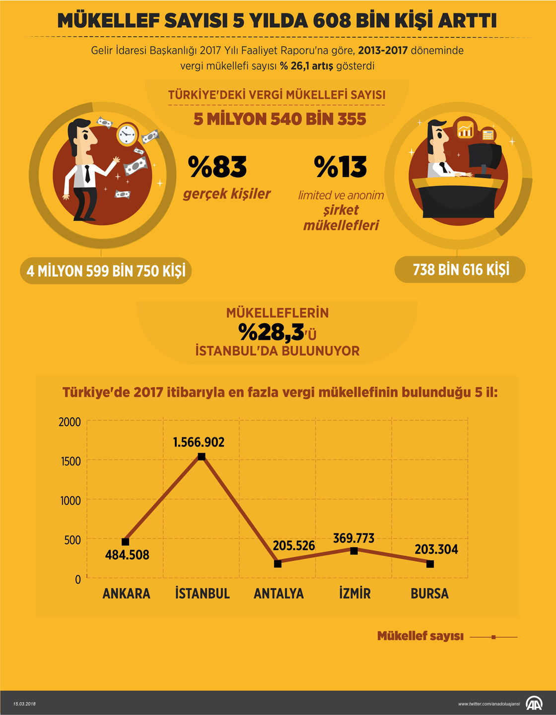 Türkiye'deki vergi mükellefi sayısı son 5 yılda 608 bin 226 kişi artarak 2017 sonu itibarıyla 5 milyon 540 bin 355'e ulaştı. ( Gözde Gültekinler - Anadolu Ajansı )