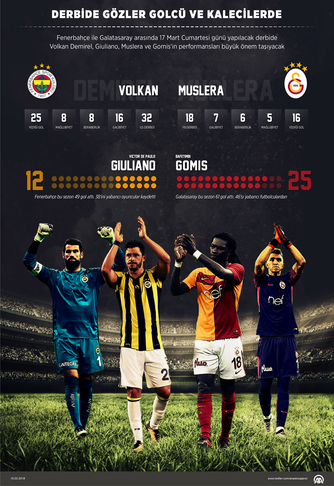 Spor Toto Süper Lig'de Fenerbahçe ile Galatasaray arasında oynanacak derbide kaleciler Volkan Demirel ile Muslera'nın sergileyecekleri performans, takımlarının alacağı sonuca önemli etki edecek. Volkan Demirel, Galatasaray'a karşı forma giydiği 32 derbide 16 galibiyet, 8 beraberlik ve 8 mağlubiyet gördü. Galatasaray, Muslera'nın kaleyi koruduğu 18 Fenerbahçe derbisinde 7 galibiyet, 6 beraberlik ve 5 mağlubiyetle sahadan ayrıldı. Fenerbahçe ile Galatasaray arasında oynanan maçlarda sarı-lacivertli ekibin 29 golünün 22'sini yabancı oyuncular kaydetti. Galatasaray'da ise Fenerbahçe ile yapılan son 27 maçta atılan 22 golün 13'ü yabancı oyuncuların ayağından geldi. ( Kemal Delikmen - Anadolu Ajansı )15 Mart 2018•Güncelleme: 15 Mart 2018