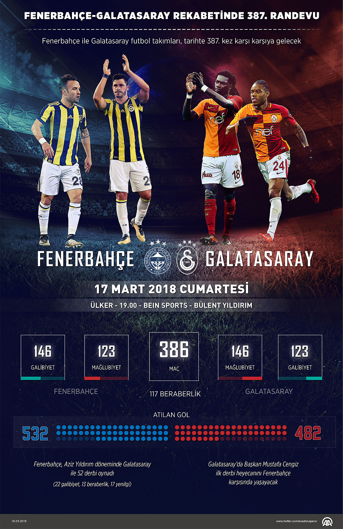 Fenerbahçe ile Galatasaray futbol takımları, Spor Toto Süper Lig'de yarın yapacakları derbiyle tarihte 387. kez karşı karşıya gelecek. Şimdiki Ülker Stadı'nın bulunduğu "Papazın Çayırı" olarak adlandırılan yerde 17 Ocak 1909 tarihinde yapılan ve Galatasaray'ın 2-0 kazandığı özel maçla başlayan 109 yıllık rekabette, galibiyetlerde ve atılan gol sayısında Fenerbahçe'nin üstünlüğü bulunuyor. Sarı-lacivertliler, geride kalan 386 maçtan 146'sını kazandı, sarı-kırmızılı ekip bu süre içinde 123 kez galip geldi. İki takım 117 maçta ise eşitliği bozamadı. Fenerbahçe'nin attığı 532 gole, Galatasaray 482 golle karşılık verdi. ( Kemal Delikmen - Anadolu Ajansı )16 Mart 2018•Güncelleme: 16 Mart 2018