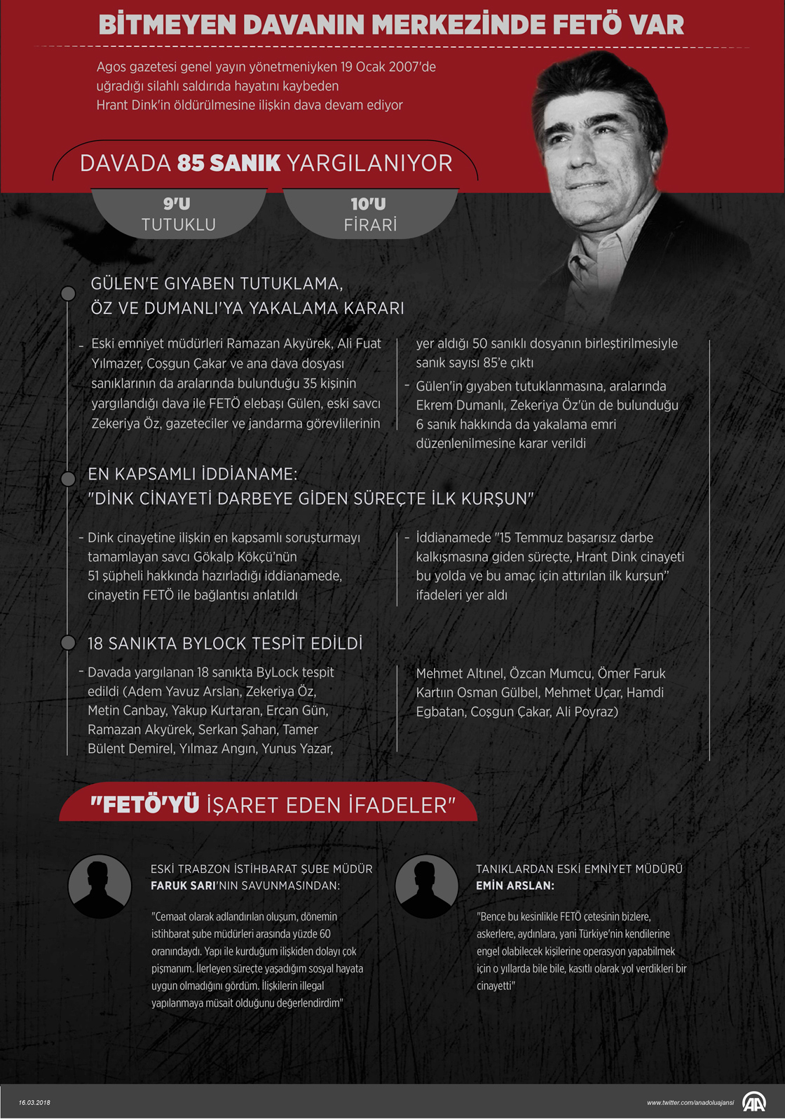 Agos Gazetesi Genel Yayın Yönetmeni Hrant Dink'in öldürülmesine ilişkin Fetullahçı Terör Örgütü (FETÖ) elebaşı Fetullah Gülen, eski savcı Zekeriya Öz, gazeteciler, jandarma ve eski emniyet görevlileri ile ana dava hükümlülerinin de aralarında bulunduğu 9'u tutuklu, 10'u firari 85 sanığın yargılanmasına devam ediliyor. ( Gözde Gültekinler - Anadolu Ajansı )16 Mart 2018•Güncelleme: 16 Mart 2018