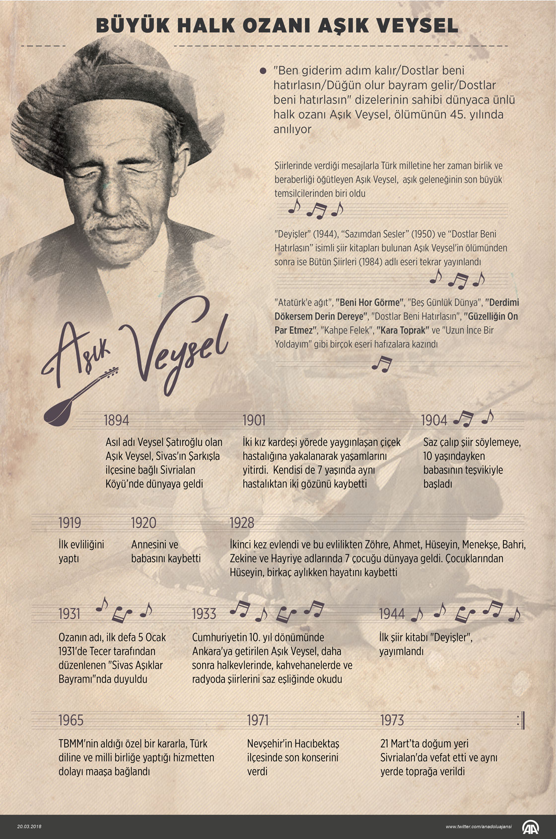 "Ben giderim adım kalır/Dostlar beni hatırlasın/Düğün olur bayram gelir/Dostlar beni hatırlasın" dizelerinin sahibi dünyaca ünlü halk ozanı Aşık Veysel, ölümünün 45. yılında anılıyor. ( Ahmet Burak Özkan - Anadolu Ajansı )