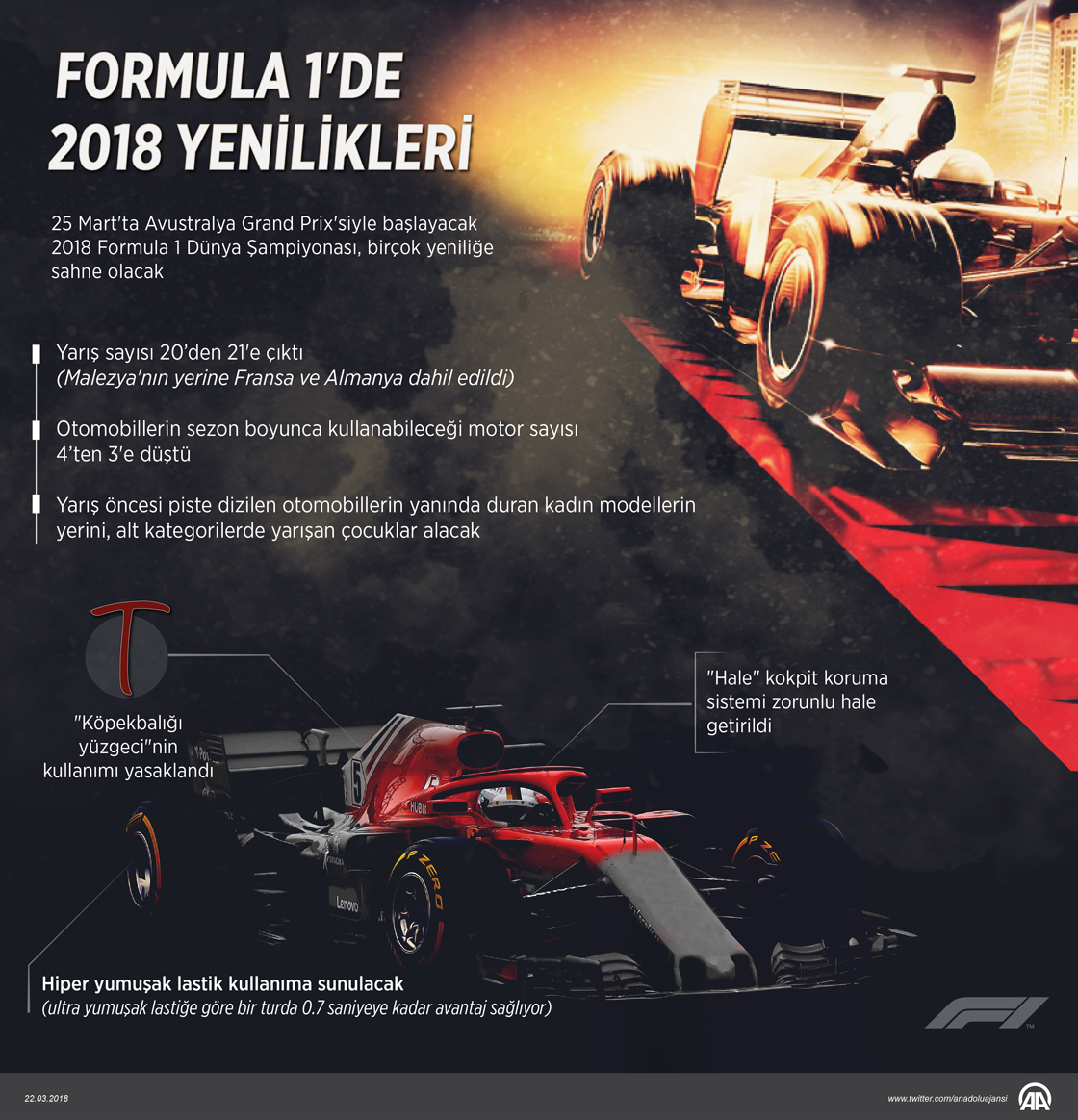 2018 Formula 1 Dünya Şampiyonası, "hale" adı verilen kokpit koruması ve hiper yumuşak lastiğin başı çektiği yeniliklere sahne olacak. Dünyanın en çok izlenen spor etkinliklerinden Formula 1'in yeni sezonu, 25 Mart'taki Avustralya Grand Prix'siyle başlayacak. Organizasyonun ticari haklarının Liberty Media'ya geçtiği 2017 sezonundaki kadar radikal olmasa bile bu yıl da teknik bakımdan değişiklikler yaşanacak. Atmosferik V8 yerine turboşarjlı V6 motorların kullanılmaya başlandığı 2014'ten itibaren Mercedes'in büyük üstünlüğüne sahne olan Formula 1'deki bazı kurallar da değişecek. ( Kemal Delikmen - Anadolu Ajansı )22 Mart 2018•Güncelleme: 22 Mart 2018