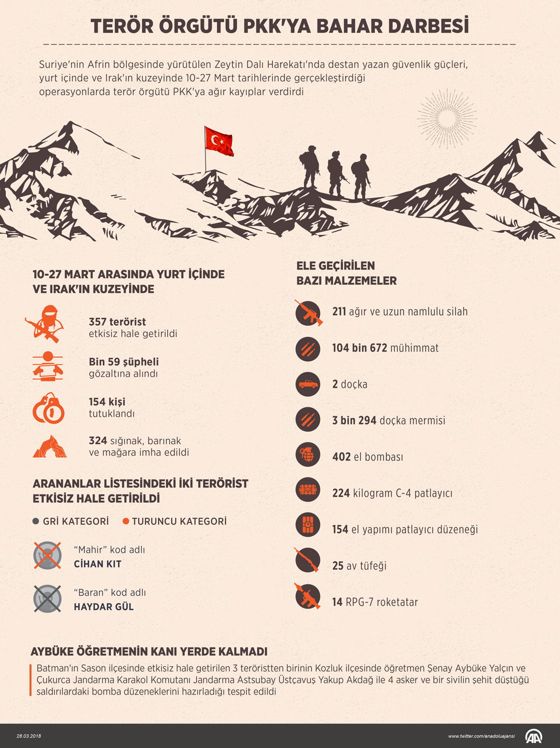Suriye'de Fırat Kalkanı ve Zeytin Dalı harekatlarında büyük kahramanlıklara imza atan güvenlik güçleri, son 17 günde yurt içinde ve Irak'ın kuzeyinde terör örgütü PKK'ya yönelik yürüttüğü operasyonlarda 357 teröristi etkisiz hale getirdi. Zorlu coğrafi koşullara rağmen gece gündüz demeden teröristlerin barınma alanlarını tek tek imha eden güvenlik güçleri, ele geçirdiği silah, mühimmat ve yaşam malzemeleriyle de PKK'ya ağır darbe vurdu. İnsansız Hava Aracı (İHA) ve Silahlı İnsansız Hava Aracı'nın (SİHA) da kullanıldığı hava destekli operasyonlarla dağları teröristlerden temizleyen güvenlik güçleri, kent merkezlerinde vatandaşların huzur ve güvenliği sağlamak için mücadelesini sürdürüyor. ( Muhammed Ali Yiğit - Anadolu Ajansı )28 Mart 2018•Güncelleme: 28 Mart 2018