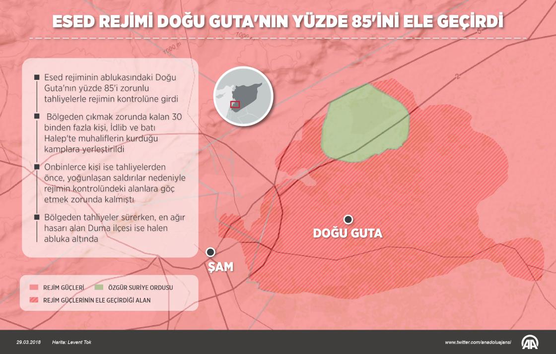 Esed rejiminin ablukasındaki Doğu Guta'nın yüzde 85'i zorunlu tahliyelerle rejimin kontrolüne girdi. Bölgeden çıkmak zorunda kalan 30 binden fazla kişi, İdlib ve batı Halep'te muhaliflerin kurduğu kamplara yerleştirildi.