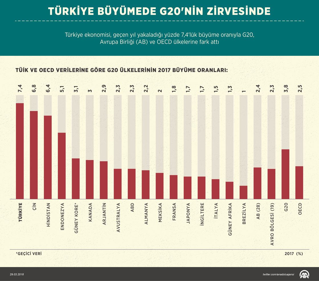 Türkiye ekonomisi, geçen yıl yakaladığı yüzde 7,4'lük büyüme oranıyla G20, Ekonomik İşbirliği ve Kalkınma Örgütü (OECD), Avrupa Birliği (AB) ülkelerine fark attı. AB ortalamasının yaklaşık 3 katı büyüyen Türkiye, dünyanın en hızlı gelişen ekonomilerinden Çin ve Hindistan'ı geride bırakarak G20'de zirvede yer aldı. (Grafik: AA/Yasin Demirci)29 Mart 2018•Güncelleme: 29 Mart 2018