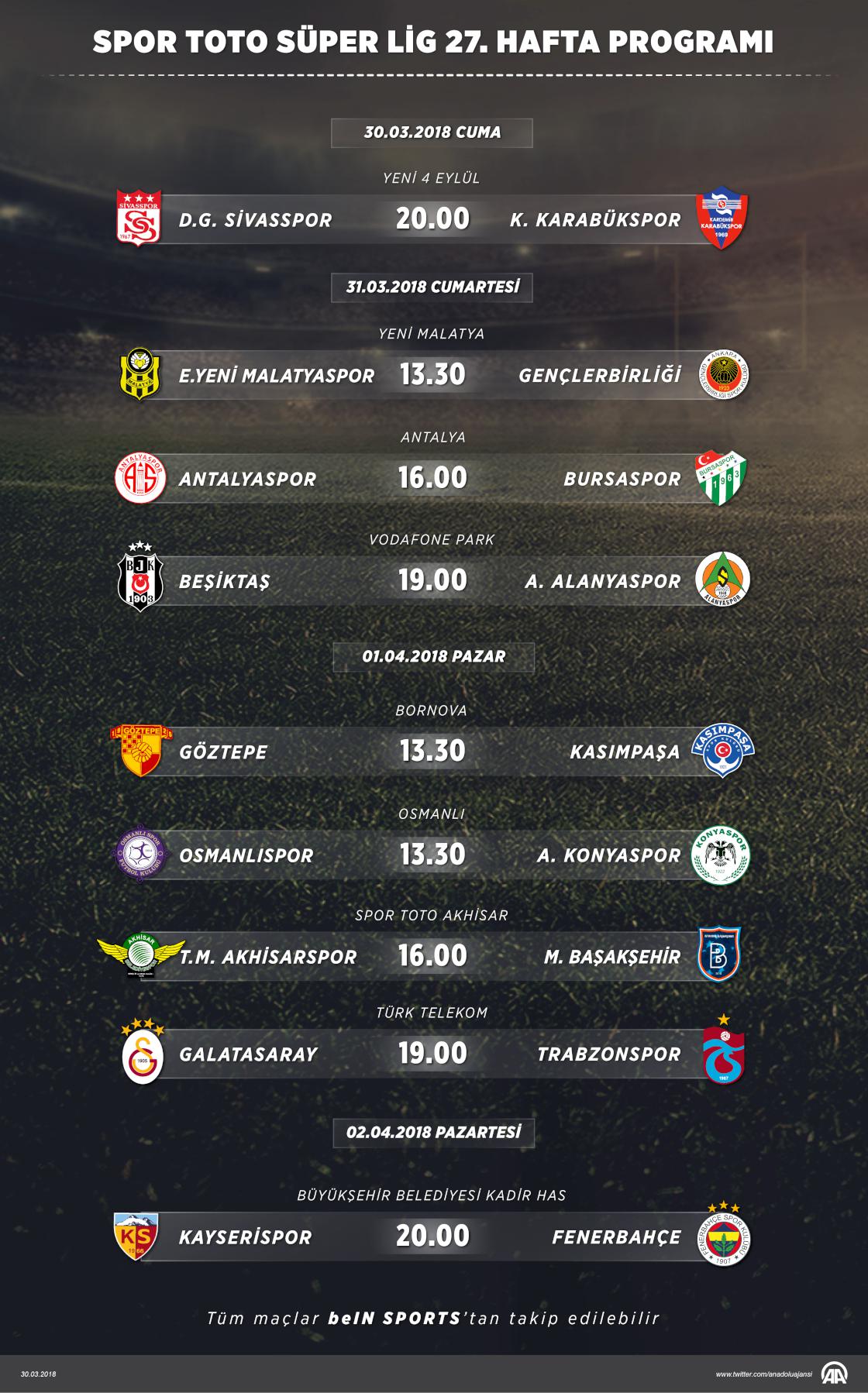 Spor Toto Süper Lig'de 27. haftanın açılış maçında bugün Demir Grup Sivasspor ile Kardemir Karabükspor karşı karşıya gelecek. Ligde 31 Mart Cumartesi 3, 1 Nisan Pazar günü 3 ve 2 Nisan Pazartesi günü tek maç oynanacak. ( Kemal Delikmen - Anadolu Ajansı )