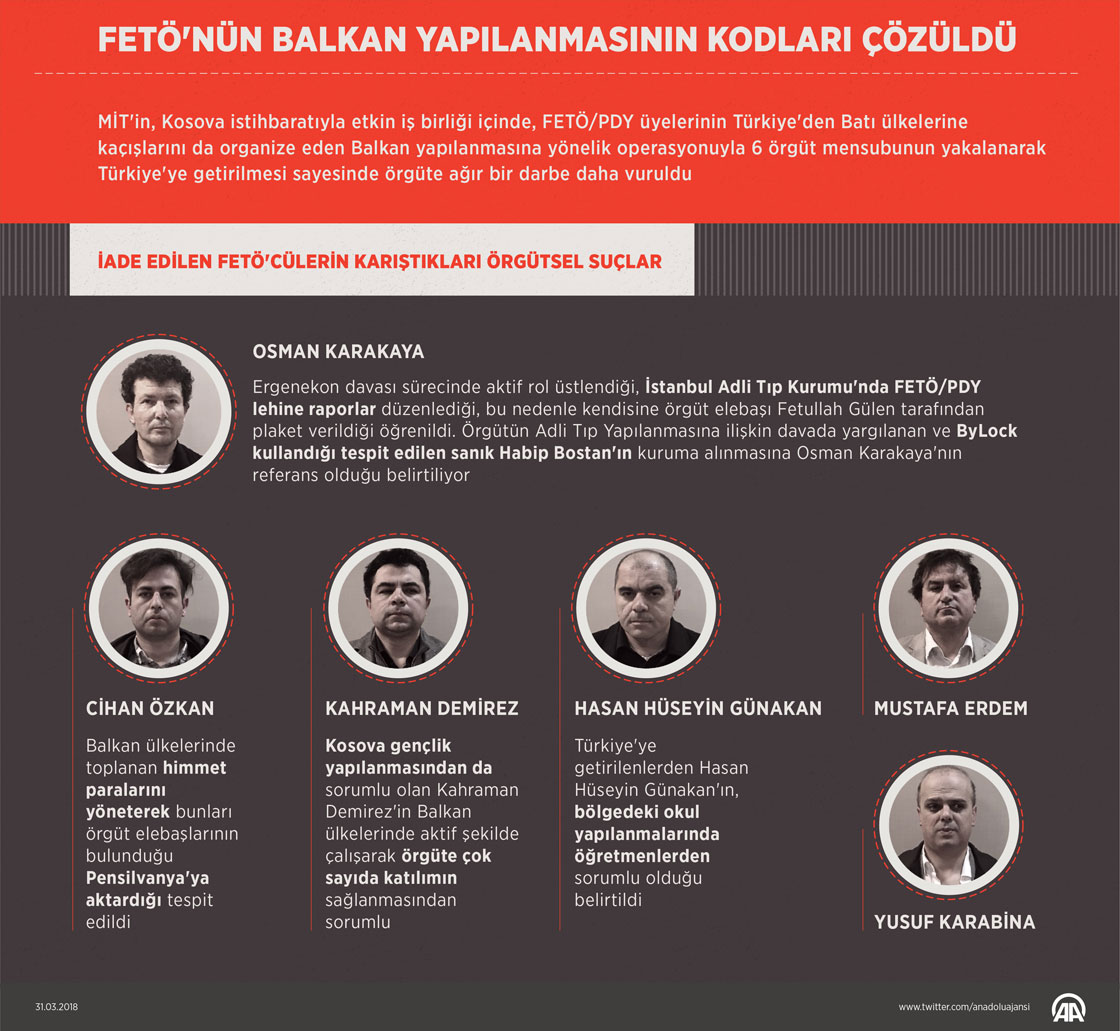 Milli İstihbarat Teşkilatı'nın (MİT), Kosova istihbaratıyla etkin iş birliği içinde, Fetullahçı Terör Örgütü / Paralel Devlet Yapılanması (FETÖ/PDY) üyelerinin Türkiye'den Batı ülkelerine kaçışlarını da organize eden Balkan yapılanmasına ilişkin operasyonuyla örgüte ağır bir darbe daha indirildi. ( Yasin Demirci - Anadolu Ajansı )31 Mart 2018•Güncelleme: 31 Mart 2018
