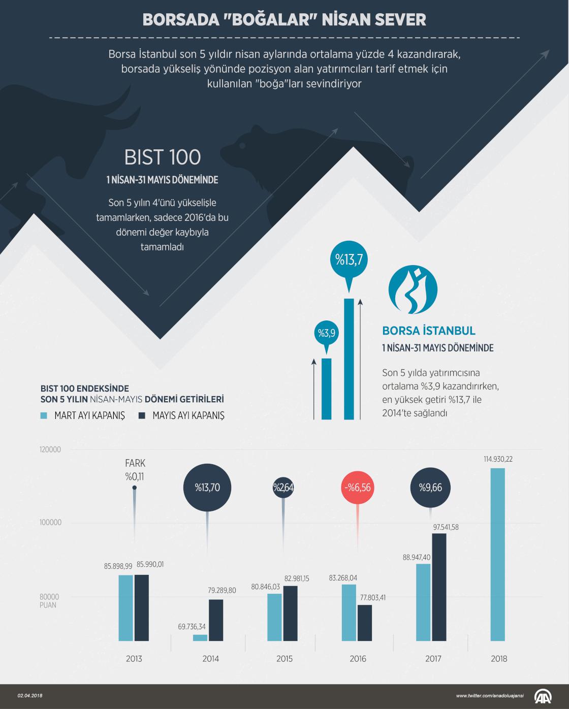Borsa İstanbul son 5 yıldır nisan aylarında yatırımcısının yüzünü güldürürken, bu dönem "boğa" olarak adlandırılan, yükseliş yönünde pozisyon alan yatırımcıları iştahlandırıyor. Borsa İstanbul, son 5 yılda yatırımcısına ortalama yüzde 3,9 kazandırırken, en yüksek getiri yüzde 13,7 ile 2014'te sağlandı. ( Ahmet Burak Özkan - Anadolu Ajansı )02 Nisan 2018•Güncelleme: 02 Nisan 2018
