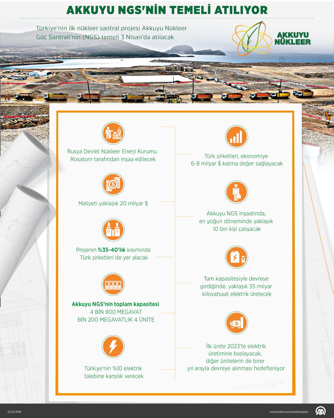 Türkiye'nin ilk nükleer santral projesi olan ve yarın temeli atılacak Akkuyu Nükleer Güç Santrali'nin (NGS) inşaatında, yaklaşık 10 bin kişiye istihdam sağlanması ve projede yer alacak Türk şirketlerinin ekonomiye 6-8 milyar dolar arasında katma değer getirmesi bekleniyor. ( Gözde Gültekinler - Anadolu Ajansı )02 Nisan 2018•Güncelleme: 02 Nisan 2018
