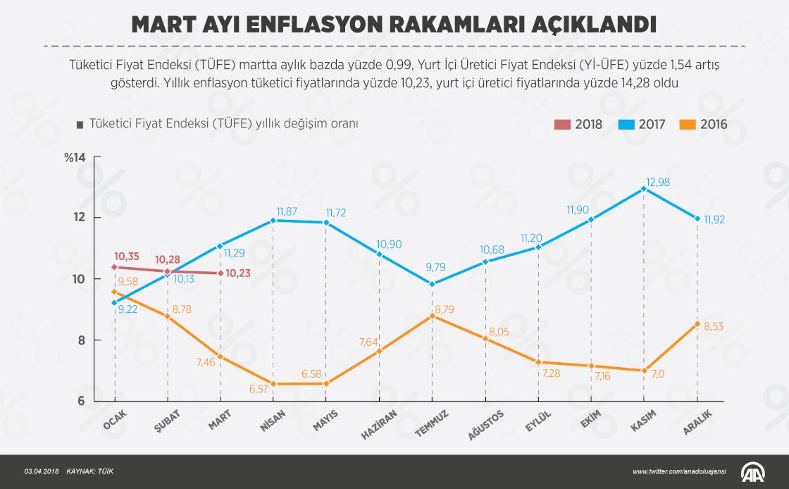 Tüketici Fiyat Endeksi (TÜFE) martta aylık bazda yüzde 0,99, Yurt İçi Üretici Fiyat Endeksi (Yİ-ÜFE) yüzde 1,54 artış gösterdi. Yıllık enflasyon tüketici fiyatlarında yüzde 10,23, yurt içi üretici fiyatlarında yüzde 14,28 oldu. ( Murat Usubaliev - Anadolu Ajansı )