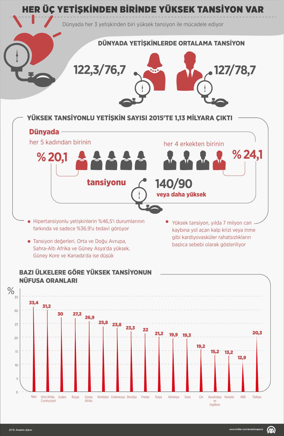 Dünyada her 3 yetişkinden biri yüksek tansiyon ile mücadele ediyor. Yüksek tansiyon, yılda 7 milyon can kaybına yol açan kalp krizi veya inme gibi kardiyovasküler rahatsızlıkların başlıca sebebi olarak gösteriliyor. ( Gözde Gültekinler - Anadolu Ajansı )06 Nisan 2018•Güncelleme: 06 Nisan 2018