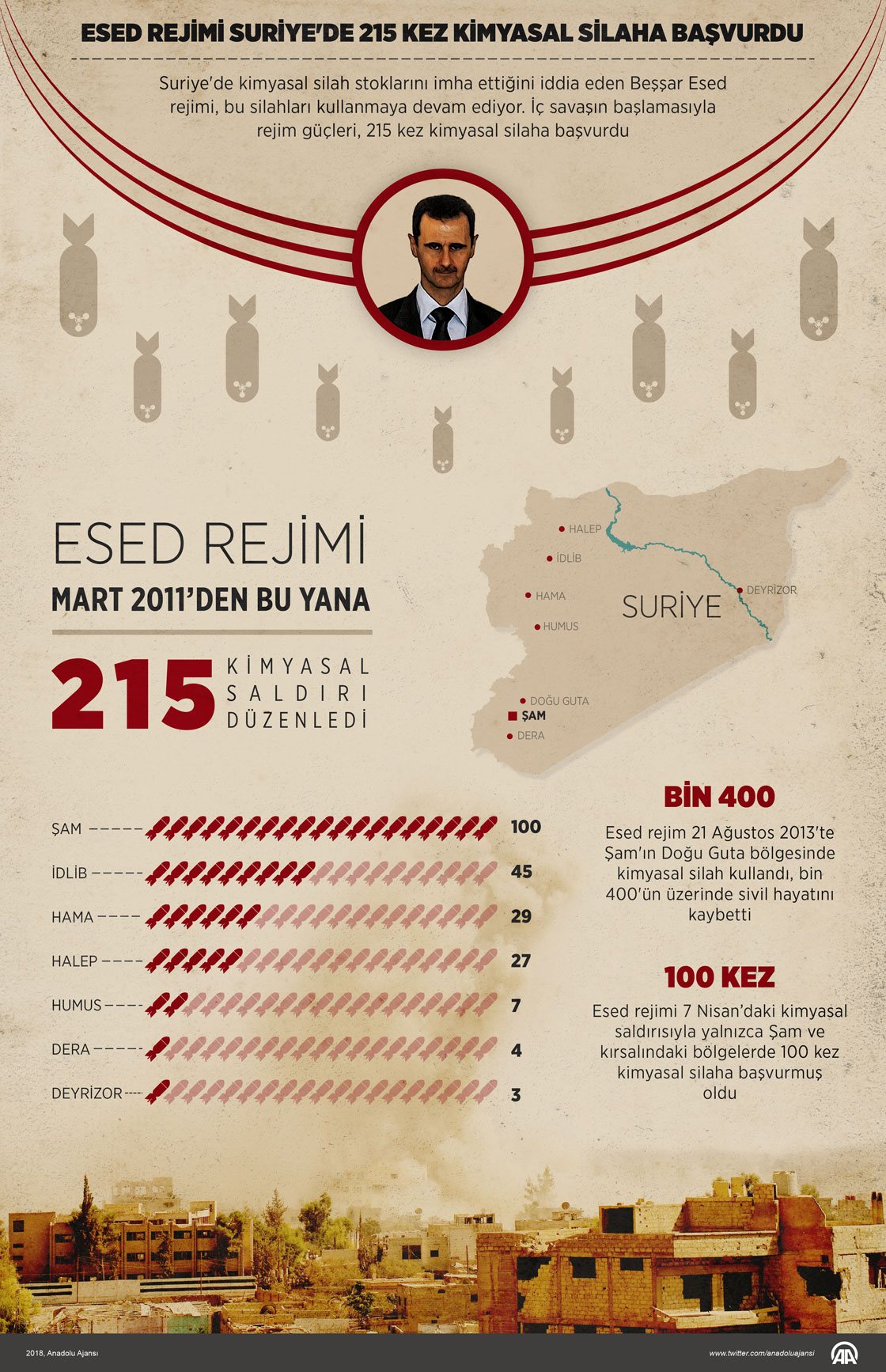 Esed rejimi Suriye'de 215 kez kimyasal silaha başvurdu