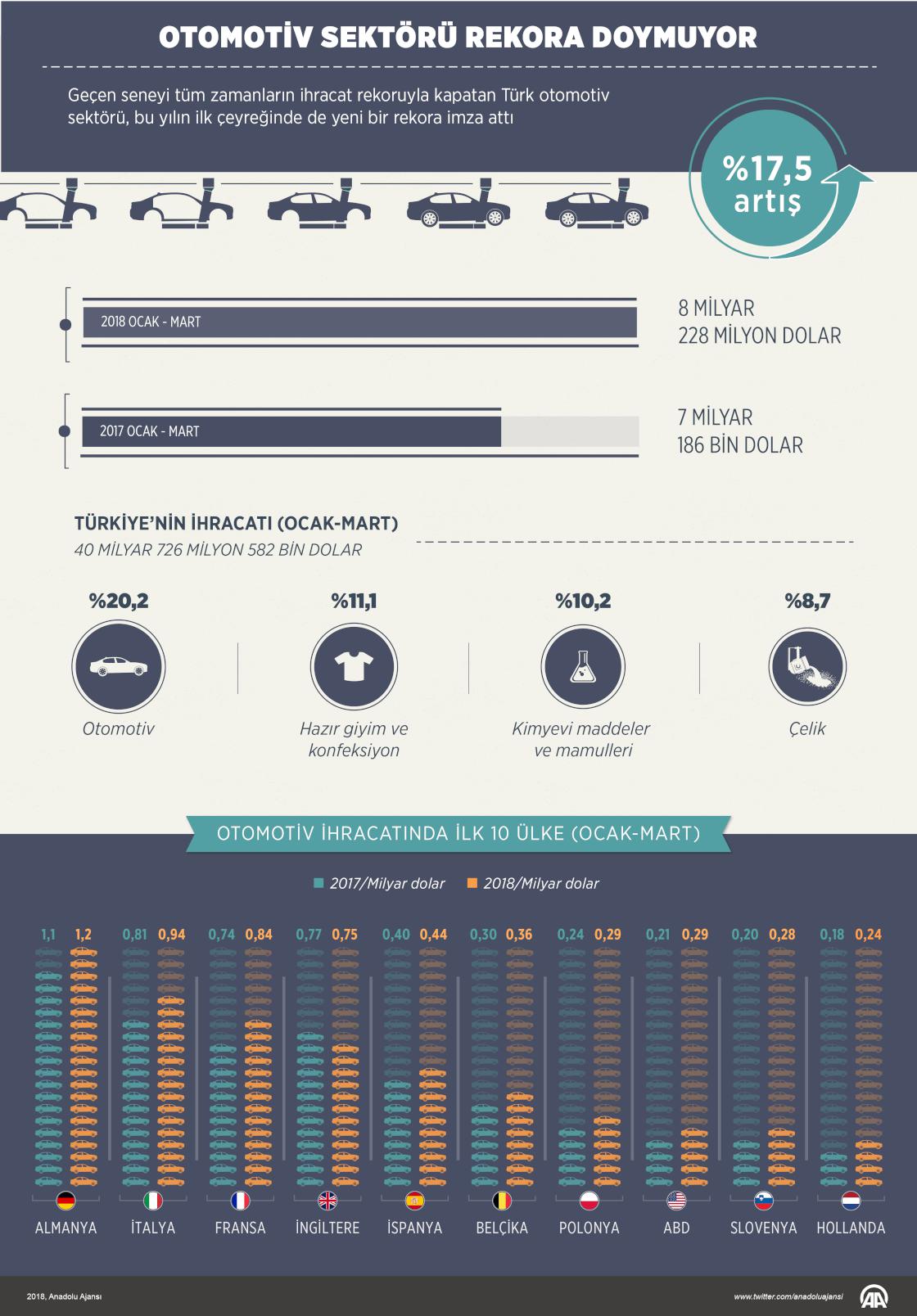 Türk otomotiv sektörü, ocak-mart döneminde 8 milyar 228 milyon dolarlık dış satımla, tüm zamanların "ilk çeyrek" rekorunu kırdı. Yıllık bazda "rekor yılı" olarak kayıtlara geçen 2017'nin ilk çeyreğinde 7 milyar dolar ihracat gerçekleştiren sektör, 2018'in aynı döneminde ihracatını yüzde 17,5 artırdı. En fazla ihracat yapılan ülkeler sıralamasında Almanya liderliğini korurken, AB üyelerinin ağırlığı dikkati çekti.