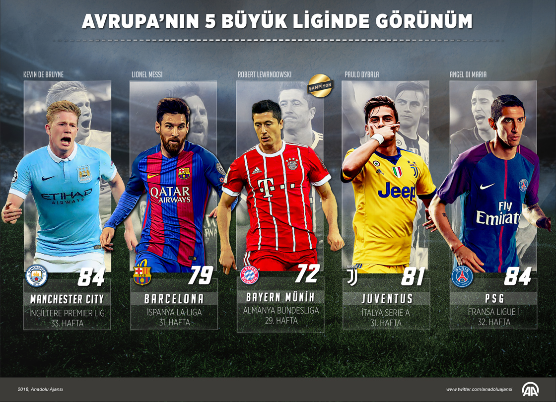 Avrupa'nın 5 büyük liginde şampiyonluğu en erken ilan eden takım Bundesliga'da Augsburg'u 4-1 yenen Bayern Münih oldu. Avrupa'nın en büyük 5 futbol ligi kabul edilen İngiltere (Premier Lig), İspanya (La Liga), Almanya (Bundesliga), İtalya (Serie A) ve Fransa'daki (Ligue 1) karşılaşmalara, hafta sonu devam edildi. Almanya'da Bayern Münih şampiyonluğunu garantilerken, İngiltere'de Manchester City, İspanya'da Barcelona, İtalya'da Juventus, Fransa'da ise Paris Saint-Germain (PSG), puan tablosunun zirvesindeki yerlerini korudu. ( Kemal Delikmen - Anadolu Ajansı )09 Nisan 2018•Güncelleme: 09 Nisan 2018