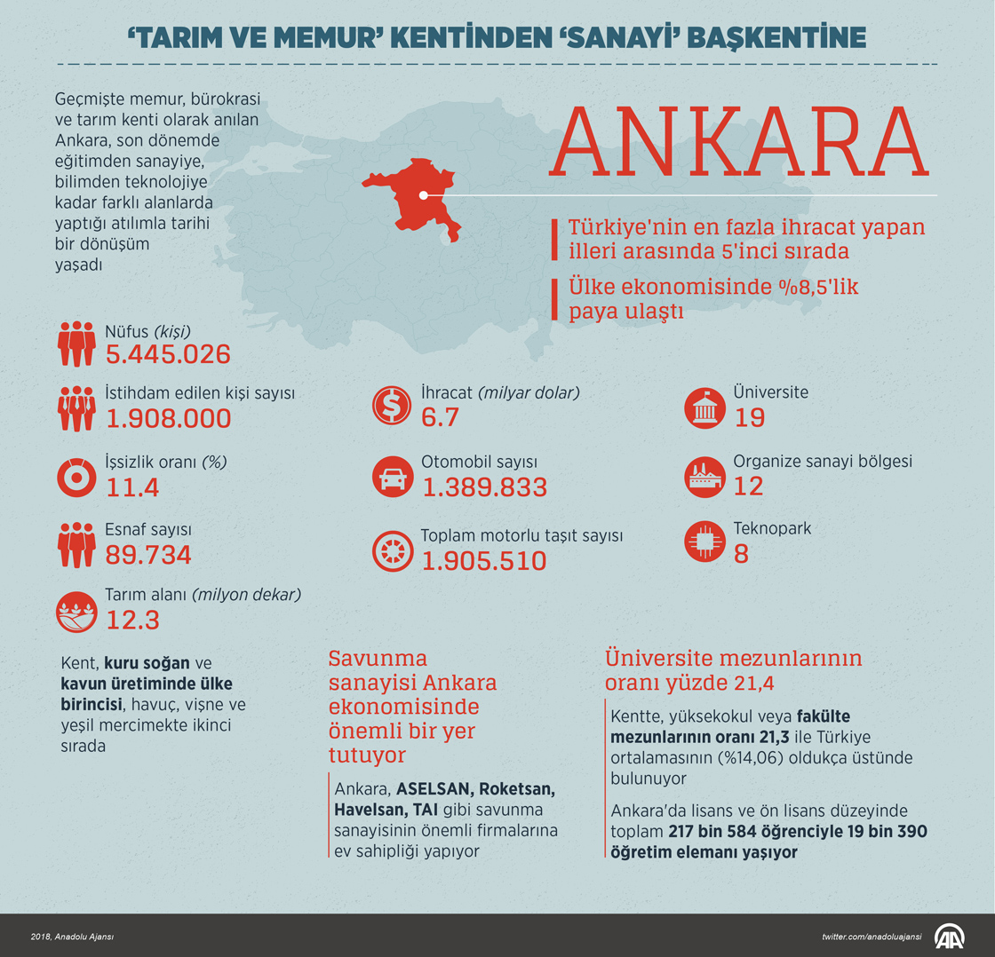 Geçmişte memur, bürokrasi ve tarım kenti olarak adını duyuran Ankara, son dönemde eğitimden sanayiye, bilimden teknolojiye kadar farklı alanlardaki atılımlarıyla tarihi bir dönüşüm yaşarken, 2023'e 5 kala ABD, Çin, İtalya, Almanya dahil dünyanın dört bir yanına ürün ihraç eden kent haline geldi. Türkiye'nin en fazla ihracat yapan 5'inci şehri olan ve ülke ekonomisinde yüzde 8,5'lik paya ulaşan Ankara'da, yurt dışına direkt uçuşların artırılması, uluslararası fuar alanının yapılması ve altyapı sorunlarının çözülmesiyle kentin dünya ölçeğindeki etkinliğinin güçleneceğine inanılıyor. ( Murat Usubaliev - Anadolu Ajansı )09 Nisan 2018•Güncelleme: 09 Nisan 2018