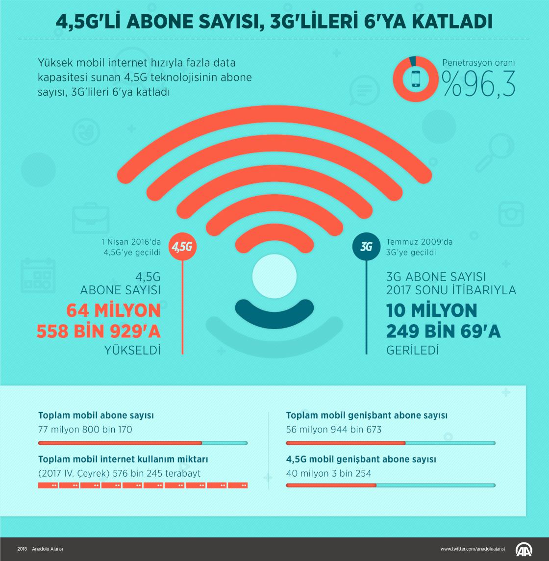 Yüksek mobil internet hızıyla fazla data kapasitesi sunan 4,5G teknolojisinin abone sayısı 3G'lileri 6'ya katladı. 4,5G'nin hayata geçtiği 1 Nisan 2016'dan geçen yıl sonuna kadar 3G abone sayısı 10 milyon 249 bin 69'a gerilerken, 4,5G abone sayısı 64 milyon 558 bin 929'a yükseldi.