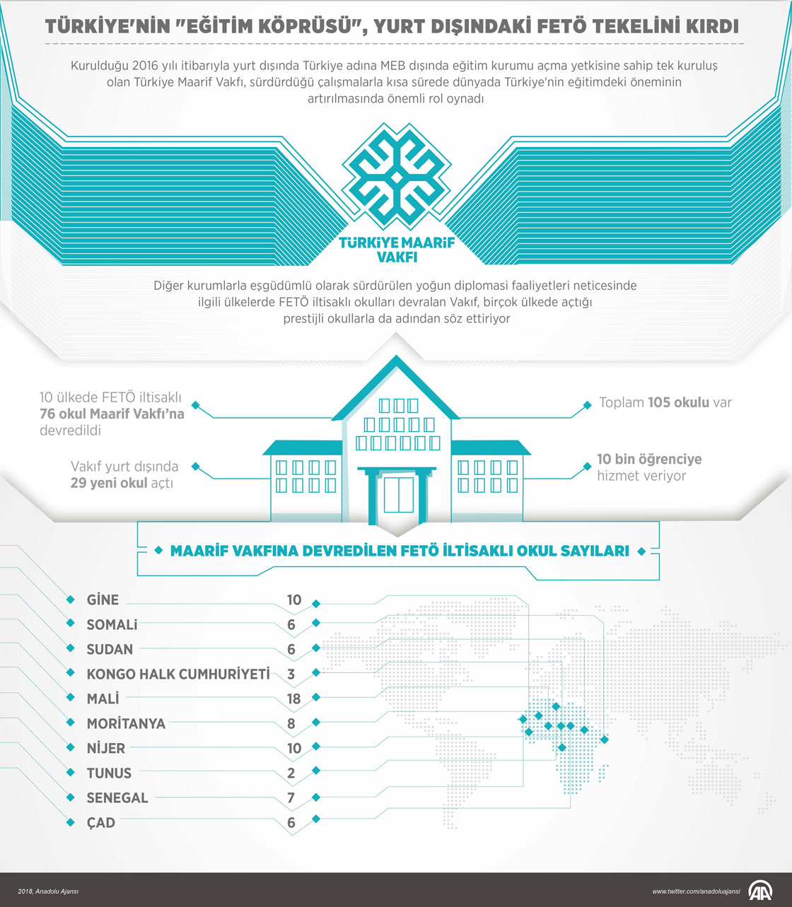 Kurulduğu 2016 yılı itibarıyla yurt dışında Türkiye adına MEB dışında eğitim kurumu açma yetkisine sahip tek kuruluş olan Türkiye Maarif Vakfı, sürdürdüğü çalışmalarla kısa sürede dünyada Türkiye'nin eğitimdeki öneminin artırılmasında önemli rol oynadı. ( Gözde Gültekinler - Anadolu Ajansı )12 Nisan 2018•Güncelleme: 12 Nisan 2018