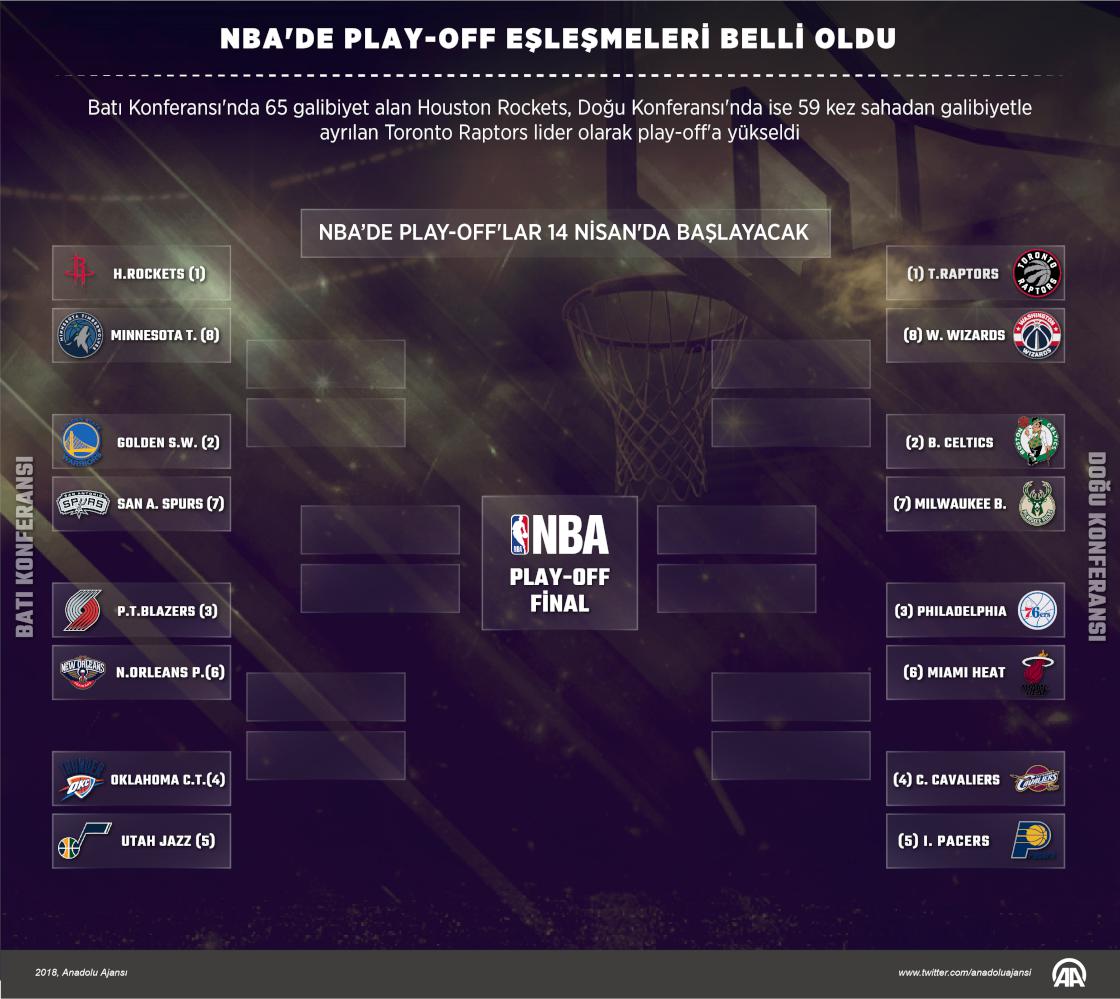 Amerikan Basketbol Ligi'nde (NBA) normal sezonun tamamlanmasının ardından play-off eşleşmeleri belli oldu. NBA'de 82 maçlık normal sezon sabaha karşı oynanan maçlarla tamamlandı. Batı Konferansı'nda 65 galibiyet alan Houston Rockets, Doğu Konferansı'nda ise 59 kez sahadan galibiyetle ayrılan Toronto Raptors lider olarak play-off'a yükseldi. Milli basketbolcu Cedi Osman'ın formasını giydiği geçen yılın finalisti Cleveland Cavaliers, play-off'ta Indiana Pacers ile eşleşti. Ersan İlyasova ve Furkan Korkmaz'ın takımı Philadelphia 76ers ise Miami Heat ile karşı karşıya gelecek. ( Kemal Delikmen - Anadolu Ajansı )12 Nisan 2018•Güncelleme: 12 Nisan 2018