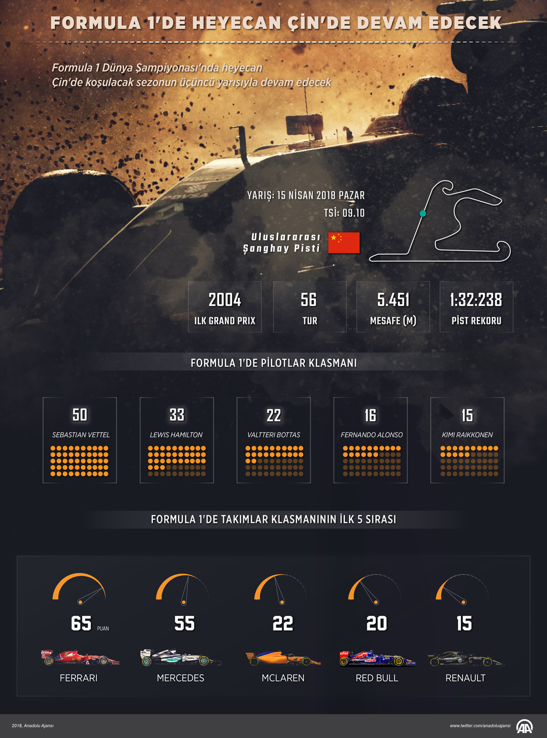 Formula 1 Dünya Şampiyonası'nda heyecan, Çin'de koşulacak sezonun üçüncü yarışıyla devam edecek. Çin'in Şanghay kentindeki 5 bin 451 metrelik Uluslararası Şanghay Pisti'nde 56 tur üzerinden yapılacak yarışın sıralama mücadelesi yarın TSİ 09.00'da başlayacak. Yarış ise 15 Nisan Pazar günü TSİ 09.10'da gerçekleştirilecek.13 Nisan 2018•Güncelleme: 13 Nisan 2018