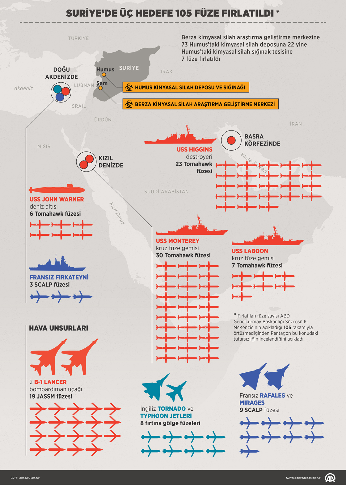ABD Genelkurmay Başkanlığı Sözcüsü Korgeneral Kenneth McKenzie, ABD, İngiltere ve Fransa’nın Suriye rejimine ait hedeflere 105 füze fırlattığını ve herhangi bir füzenin Suriye hava savunma sistemlerince vurulmadığını söyledi. ( Murat Usubaliev - Anadolu Ajansı )15 Nisan 2018•Güncelleme: 15 Nisan 2018